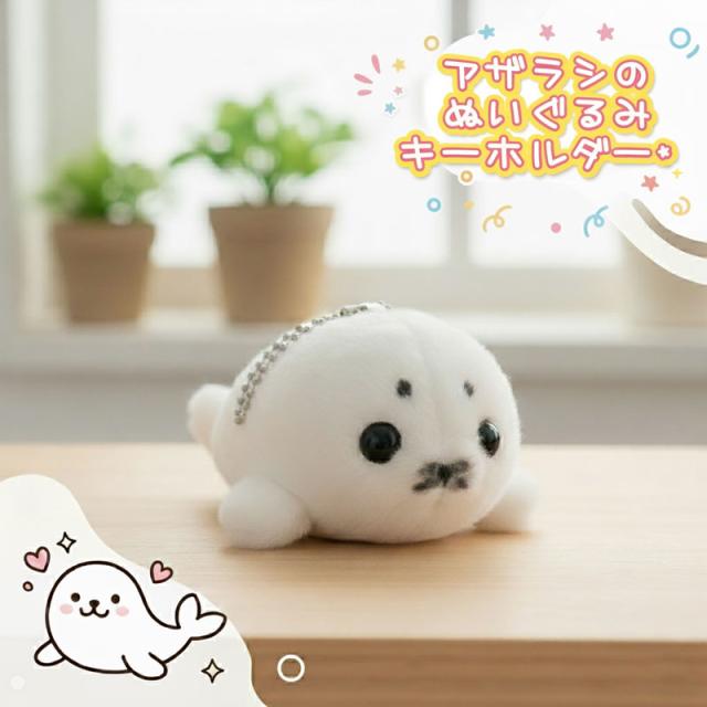 ふわふわ、もこもこの柔らかな手触りと、つぶらな瞳がたまらないアザラシのぬいぐるみキーホルダーです。