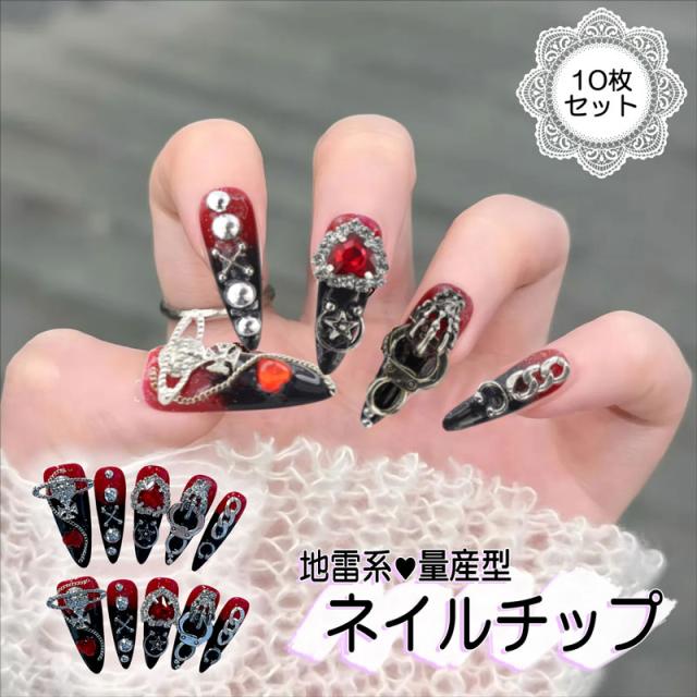 送料無料 10枚セット ネイルチップ 派手 デコレーション デコネイル ジェルネイル スカルプ 3D 立体 量産型 地雷系 原宿系 ロリータ イベント ゴテゴテ ハート チェーン クロス 付け爪 つけ爪