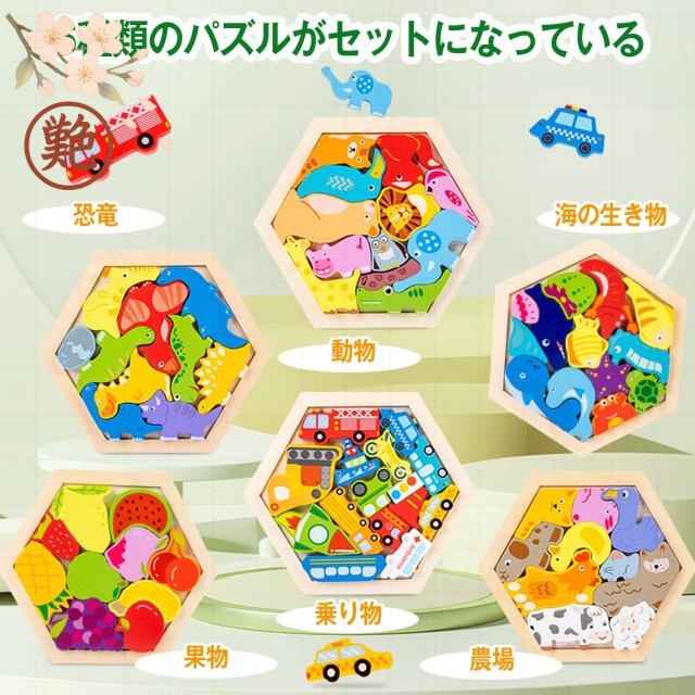 平面タイプ・形合わせ:「指定された六角形の穴に合うパーツをはめ込んでいく」というシンプルな遊び方です!更にヒントとして六角形のボードに下絵が描いています、難易度が高くないで、初めての子どもでも挑戦してみてはいかがでしょうか