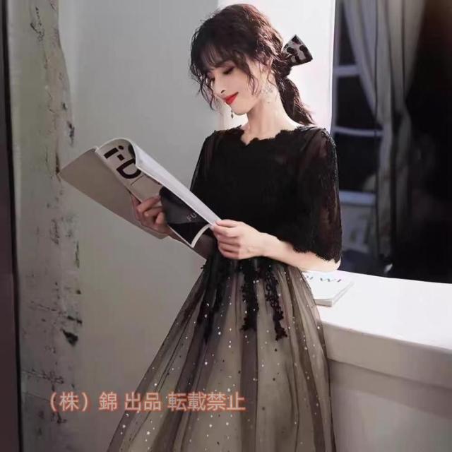 パーティードレス結婚式二次会ワンピース袖ありロングお呼ばれドレス黒レースかわいい個性的チュール半袖春夏20代30代
