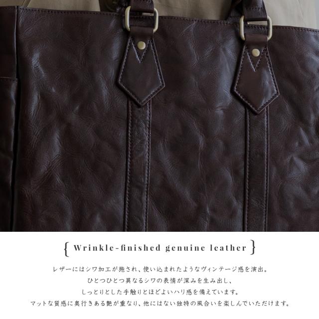 シワ加工を施した本革は、一つひとつ異なる表情を持ち、ヴィンテージ感と高級感を演出。