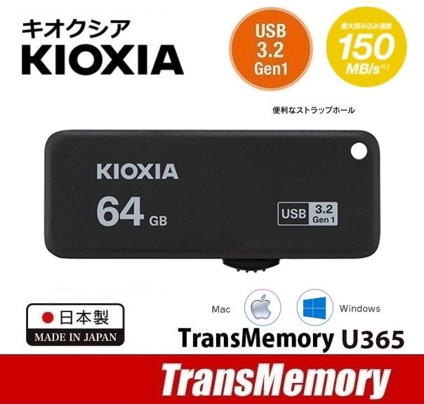 キオクシア USBメモリ 64GB KIOXIA USB3.2 フラッシュメモリ 150MB/s TransMemory U365 スライド式 ブラック KUS-3A064GK 東芝