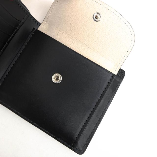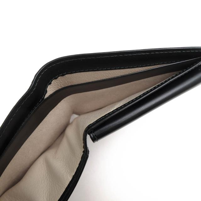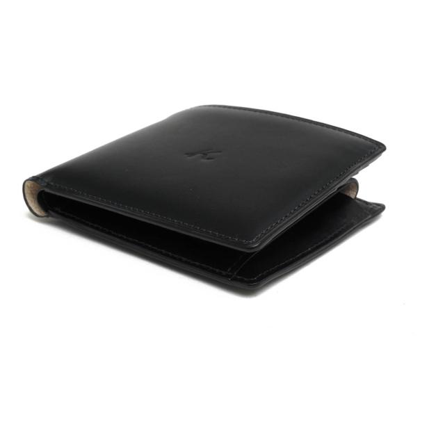 使うほどに手に馴染むヌメ革をメイン素材に使用した定番二つ折り財布。デザインはシンプルながら、ステッチの色がさりげないアクセントとなっており、品のある印象を与えます。裏地には豚革を採用しており、耐久性の高い作り。小銭入れはかぶせホック式で安全に収納でき、お札入れには仕切りがあります。カードは4枚収納可能で、さらに3つの内ポケットも備えているため、整理しやすく実用的です。