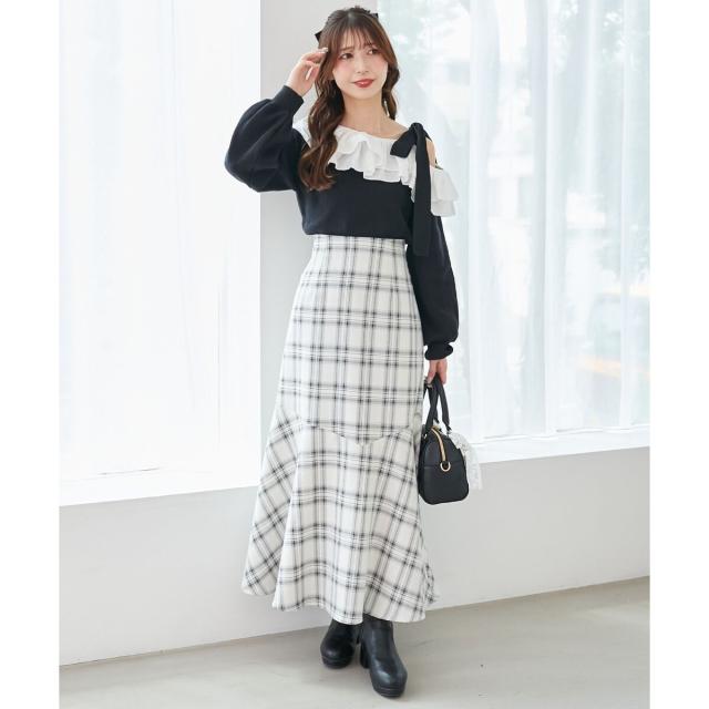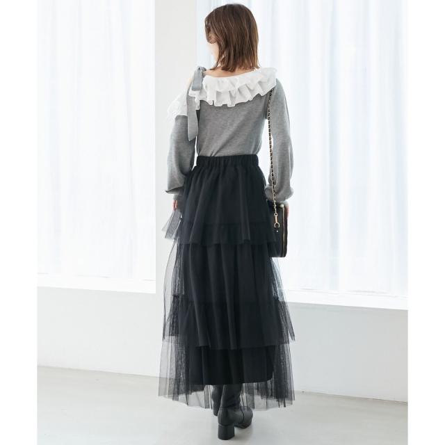 フリルにボリュームがあるのでボトムスはコンパクトなシルエットのものを合わせるとバランス◎