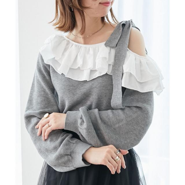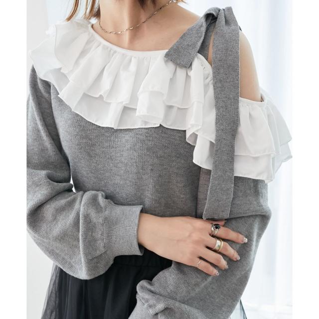 ボリューム感のあるフリルが視線を集める、ワンショル風デザインのニットトップス。