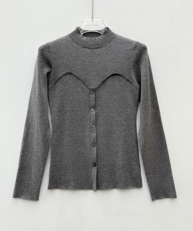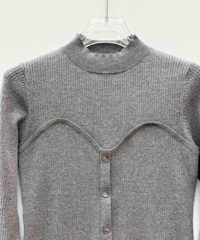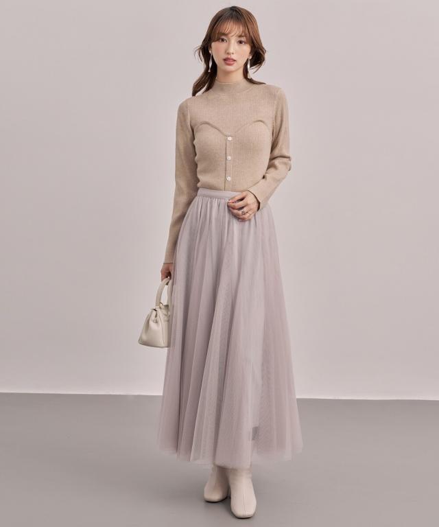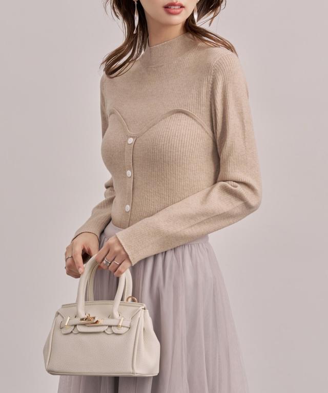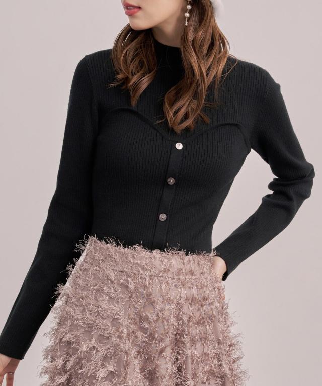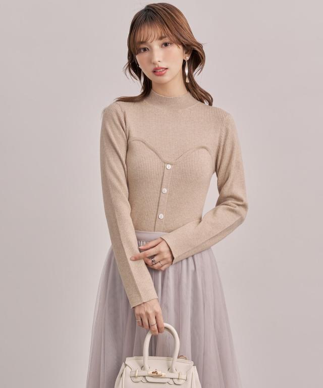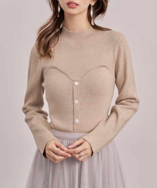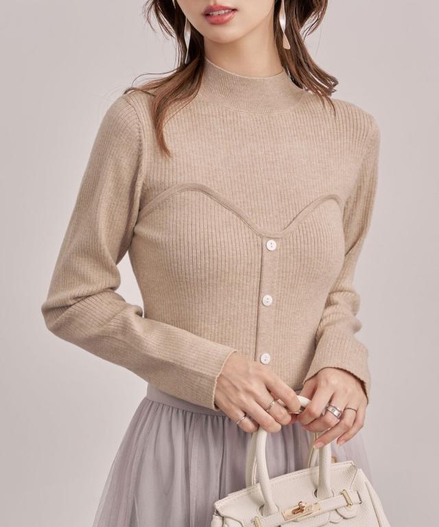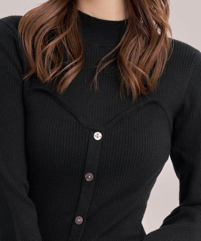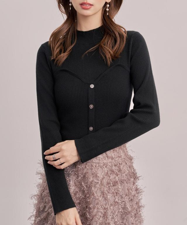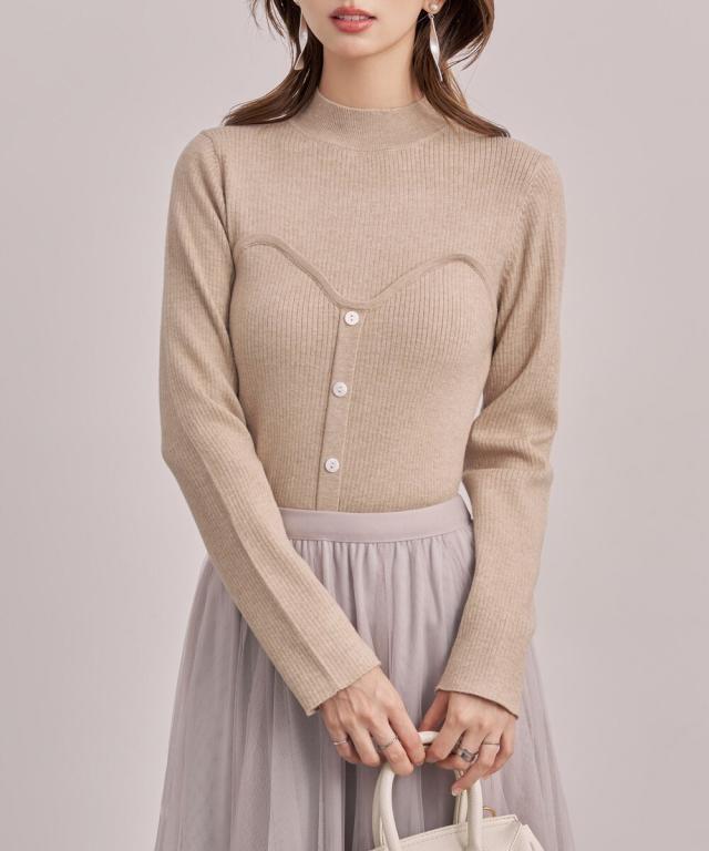 ■胸元にスイートハート切り替えしで、編み地の変化、前立てに釦飾り付けでレイヤードせずともこなれ感をプラスしてくれるビスチェ風のリブニット。