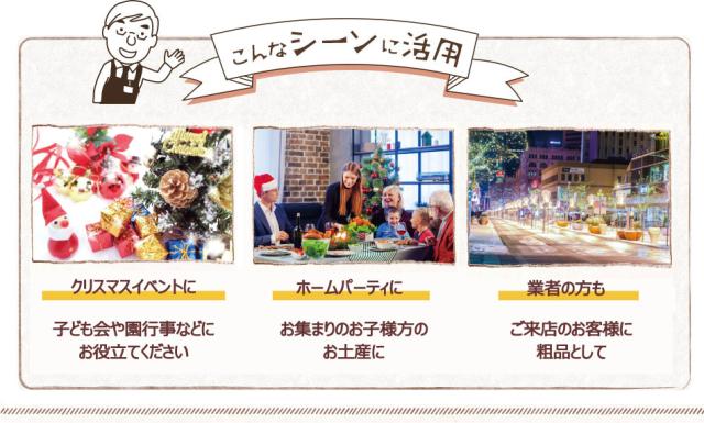 クリスマス会やクリスマスイベントなどで、景品やプレゼントにお使いいただけます。