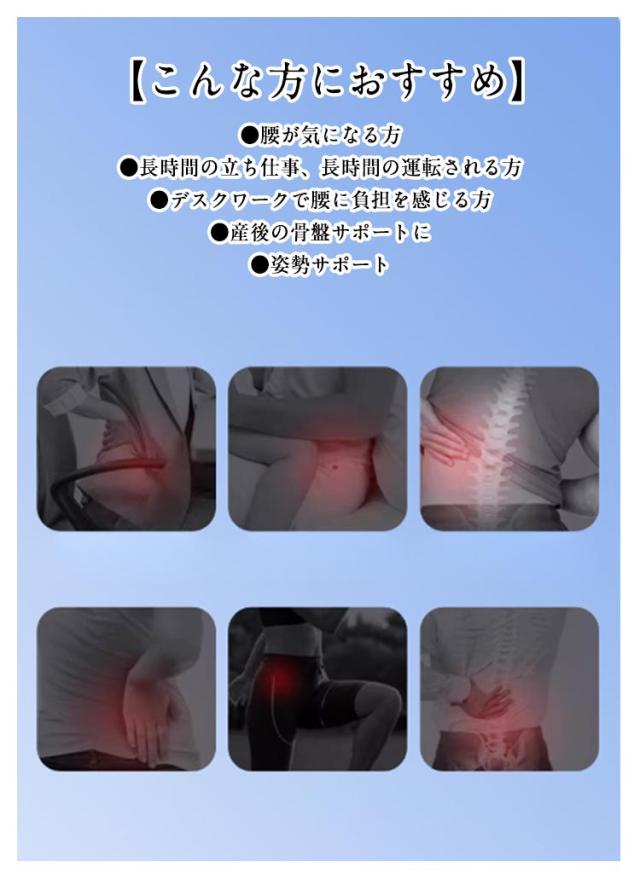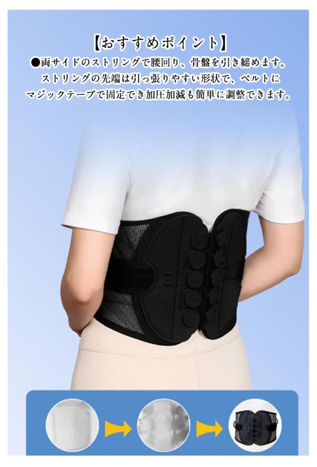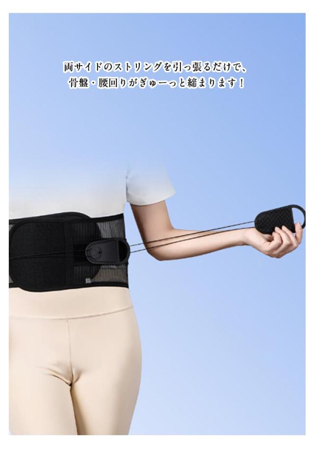 | 【骨盤・腰ベルト】 【S〜3XL】 両サイドのストリングを引っ張るだけで、骨盤・腰回りがぎゅーっと締まります! 【おすすめポイント】 ●両サイドのストリングで腰回り、骨盤を引き締めます。ストリングの先端は引っ張りやすい形状で、ベルトにマジックテープで固定でき加圧加減も簡単に調整できます。 ●長時間着けていても蒸れずにストレスにならない、メッシュ構造。 ●着けていてもかさばらないスリム設計で服の下でも装着可能です。 【こんな方におすすめ】 ●腰が気になる方 ●長時間の立ち仕事、長時間の運転される方 ●デスクワークで腰に負担を感じる方 ●産後の骨盤サポートに ●姿勢サポート | |