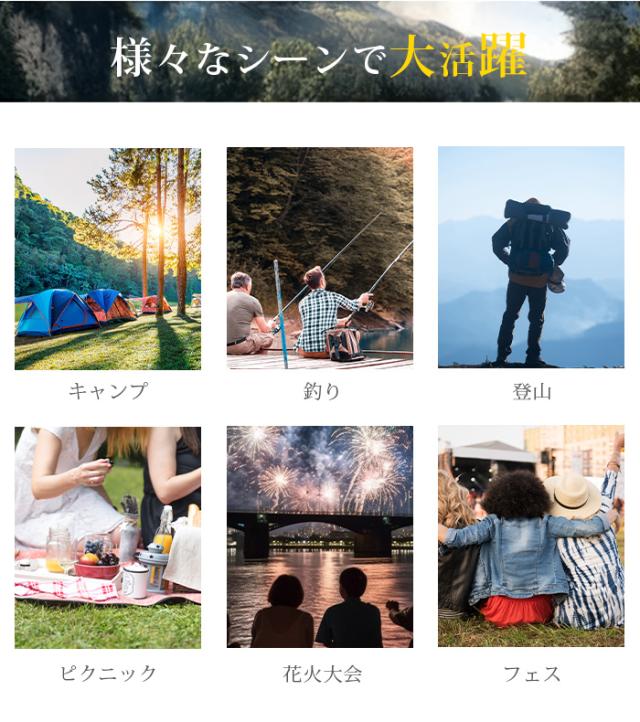 キャンプ、釣り、登山、撮影、花火大会、バーベキュー、フェスなど様々なシーンで大活躍します。