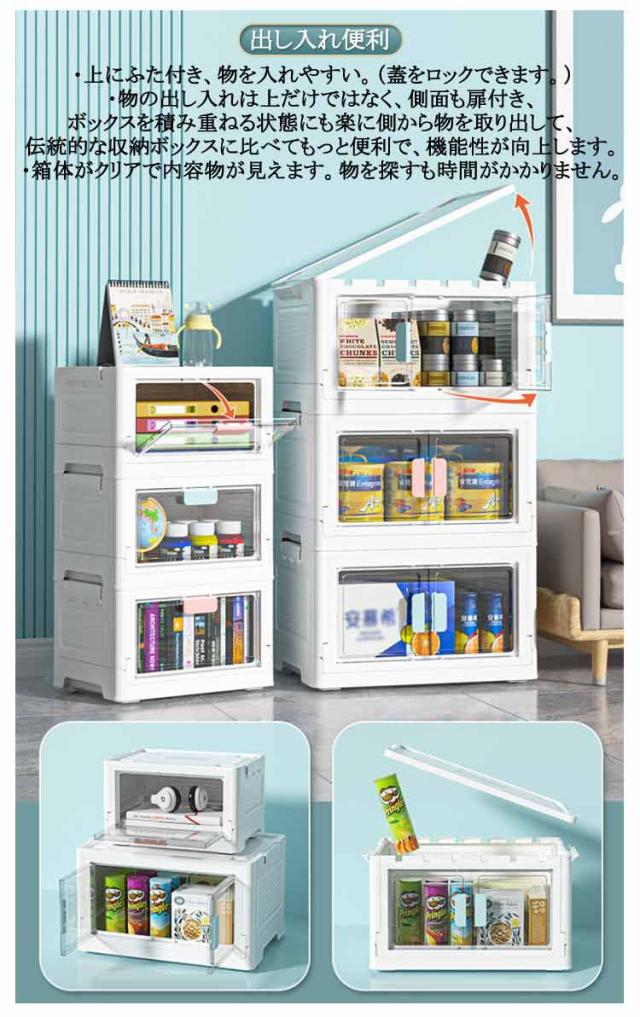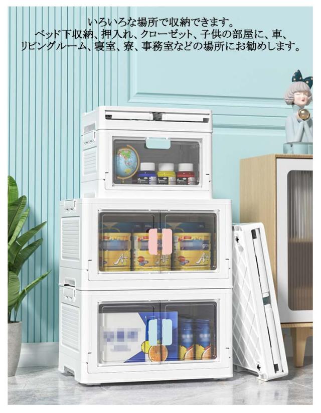 | 【前開き】【折り畳み式】【キャスター付き】 【出し入れ便利】 ・上にふた付き、物を入れやすい。(蓋をロックできます。) ・物の出し入れは上だけではなく、側面も扉付き、ボックスを積み重ねる状態にも楽に側から物を取り出して、伝統的な収納ボックスに比べてもっと便利で、機能性が向上します。 ・箱体がクリアで内容物が見えます。物を探すも時間がかかりません。 【スペース活用】 溝が付いているので、積み重ねて使用することで、効率よく収納スペースが活用できる収納ボックスです。 【持ち運び便利】 箱の底はキャスターが付き、重くても楽に移動できます。両側ハンドルもあり持ち運ぶもとても便利です。 【丈夫耐用】 実用性も強いです。本体は高品質なPPを採用し、高い靭性、耐磨耗・引き裂きに強く、より強い荷重能力があります。使用するときは何個のボックスを積み重ねて形を変えられません。 【スッキリ収納】 このコンテナボックスは使わない時折りたたんで収納できます、車内や室内のちょっとした隙間に置くことができます。 【防塵&防湿】 上のふたと側面の扉もロックできます。ホコリ防止、防塵・防カビ・防湿・防虫ができます。 いろいろな場所で収納できます。ベッド下収納、押入れ、クローゼット、子供の部屋に、車、リビングルーム、寝室、寮、事務室などの場所にお勧めします。 丈夫なつくりなので、アウトドアでもガンガン使えます。キャンプやアウトドア、車内収納にもオススメです。 | |