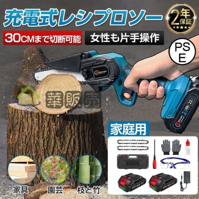 付属品:チェーンソー本体*1、バッテリー*1、充電器1*、収納箱*1、チェーン*1、ドライバ*1、ゴーグル*1、手袋*1、オイルボトル*1
