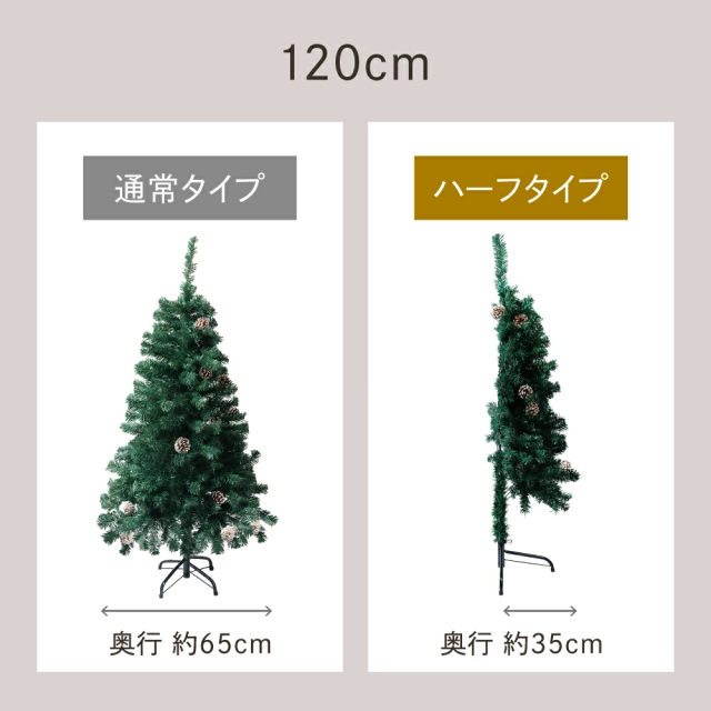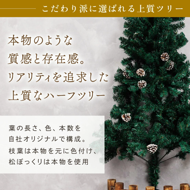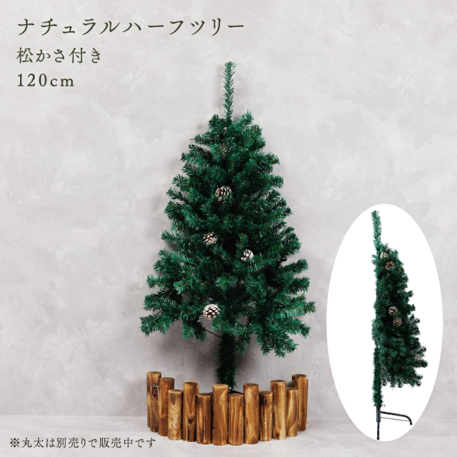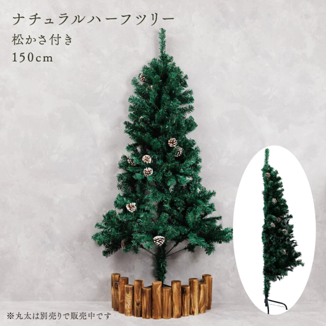 本格派ハーフクリスマスツリーは、奥行き約半分の省スペース設計で狭いお部屋でも飾れます。飾り付けや片付けも簡単で、葉色は本物のクリスマスツリーに近く、松ぼっくりも本物を使用。使用しない時期はコンパクトに収納可能。サイズは120cmと150cmの2種類。北欧風で壁際にも置きやすく、リビングや室内インテリアに最適。クリスマス雑貨としても人気のおしゃれなハーフツリーです。