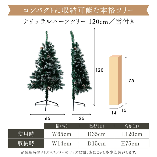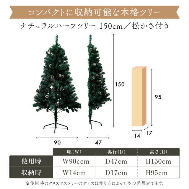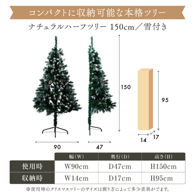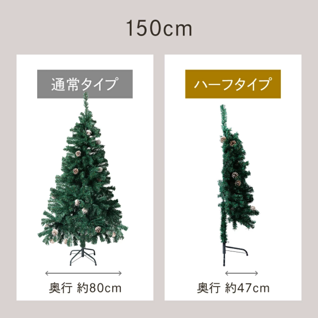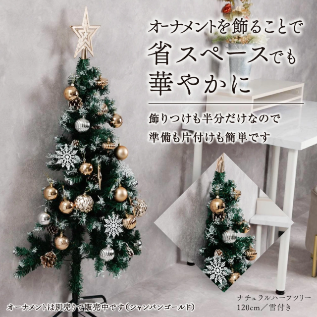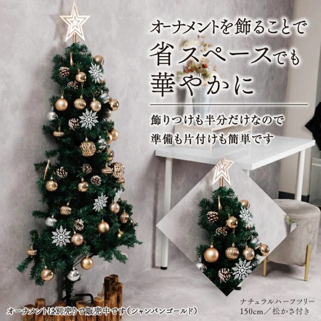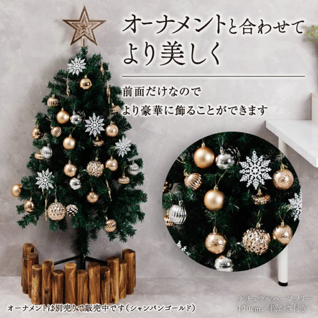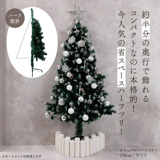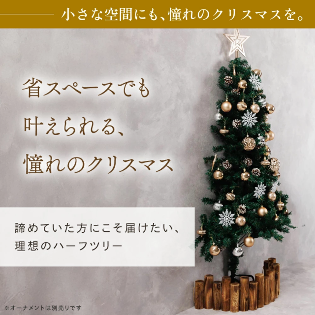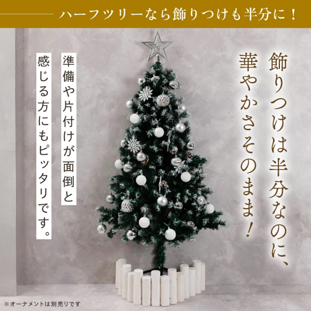 約半分の奥行で飾れるハーフツリー。省スペース設計で「大きなツリーを置きたいけど場所がない」方に最適。飾りつけも半分なので準備・片付けがラクです。