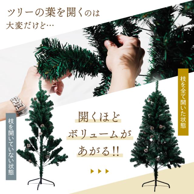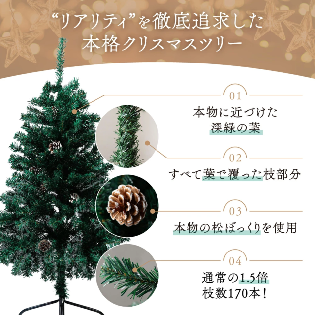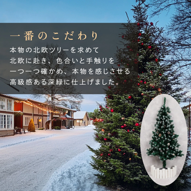本物のクリスマスツリーの葉色を再現し、松ぼっくりも本物を使用。自然な風合いでオーナメント映えします。