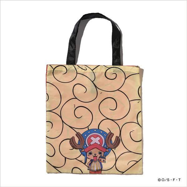 大人気TVアニメ『ONE PIECE』とのスペシャルコラボレーションアイテム。悪魔の実”ヒトヒトの実”デザインのトートバッグ。小さく折りたたみができA4サイズが収納可能。