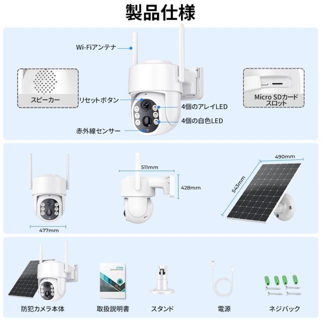 パッケージ内容:防犯カメラ本体 ソーラーパネル付き ネジ(部品) 取扱説明書 保証カード