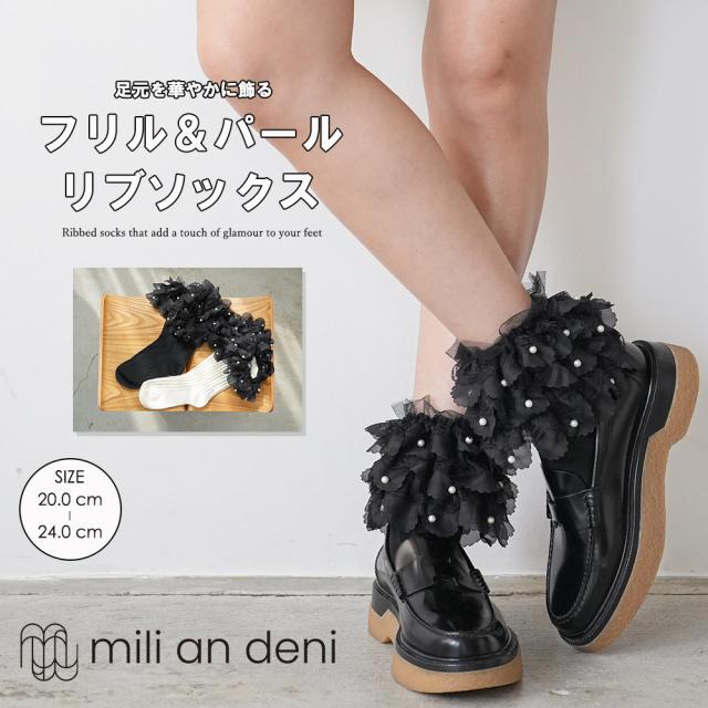 春新作 パール付きフリルソックス アクセサリー 靴下 ミドル丈 リブ 20cm-24cm レディース 春夏 チャーム ミリアンデニ メール便(郵2)対応 ac61124