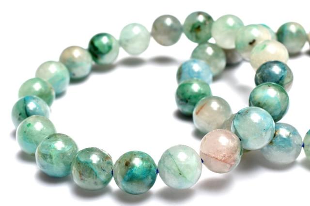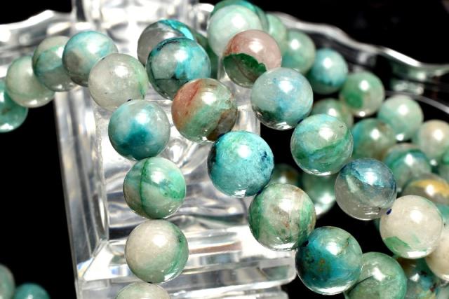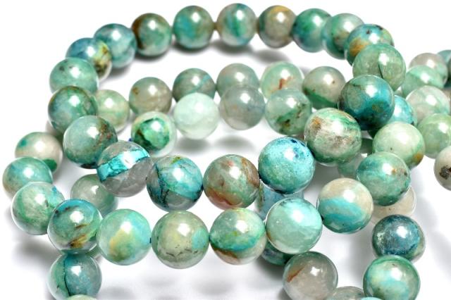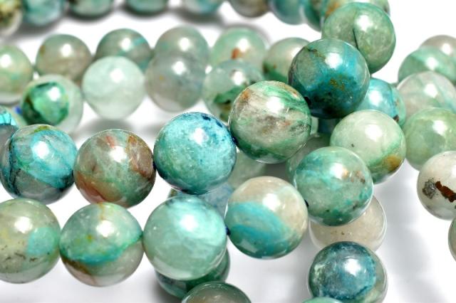 | 特徴・意味 | シリカに浸透した芸術的な模様が神秘的でなんとも魅力。 一珠ずつ異なった唯一無二の地球模様をお手元でご堪能くださいませ。 クリソコラは、銅鉱床の酸化帯で、アジュライトやマラカイト、ヘマタイト等とともに産出します。 クリソコラは和名を「珪孔雀石(けいくじゃくせき)」と言います。 マラカイトの和名を「孔雀石」と言いますが、クリソコラの和名と似ている理由はマラカイトの組成に、珪素を加えたような組成となっているからです。 ブルーが本体の多くを占め、グリーンやブラウンなどのカラーが混ざり合って、出来ているため、丸く加工されたクリソコラは、宇宙から見た地球のような外観となっています。 |