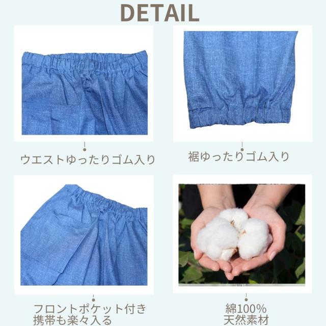 【カラー】 1.ブルー2.ネイビー3.オレンジ4.グリーン柄無地日本製 和風無地和風もんぺ。涼しく動きやすい。前側片ポケット付き。【サイズ】 Mサイズ ウエスト64.0-70.0ヒップ87.0-95.0股下59.0Lサイズ ウエスト69.0-77.0ヒップ92.0-10股下60.0LLサイズ ウエスト77.0−85.0ヒップ97.0-105股下62.03Lサイズ ウエスト85.0-93.0ヒップ102-110股下65.0【ウェストの締め方】総ゴム【素材(生地・毛糸)】綿 100% 和風【無地裾の長さ(丈)】 10分丈【シーズン】 夏・春・秋【テイスト(ファッション)】カジュアル 【和風生産国】 日本【商品説明】こちらのもんぺは、夏に涼しいもんぺ レディースです。おうち時間をゆったりとあなたらしく過ごして頂くためのリラパンです。農作業 ズボンとしてもとても涼しく、過ごしていただける商品です。農作業を涼しいく、あなたの時間の意手伝い、お悩み解決レディース もんぺでございます。