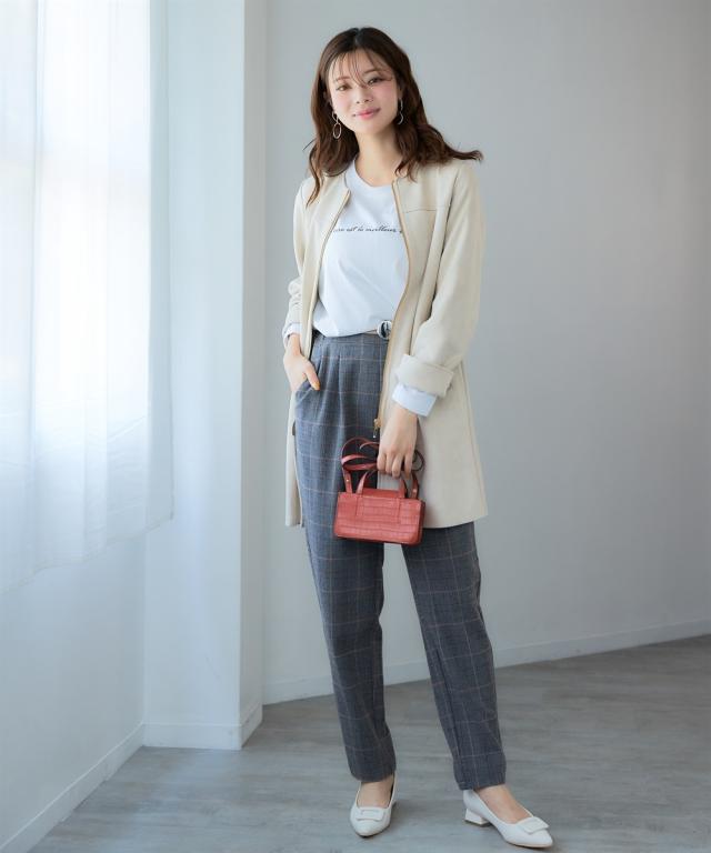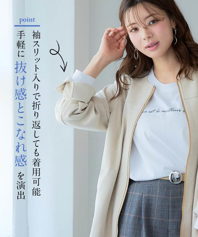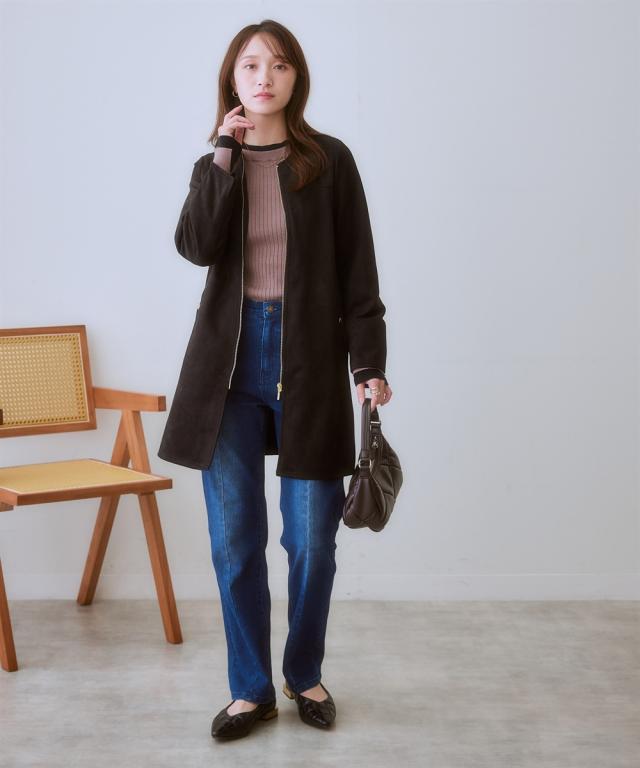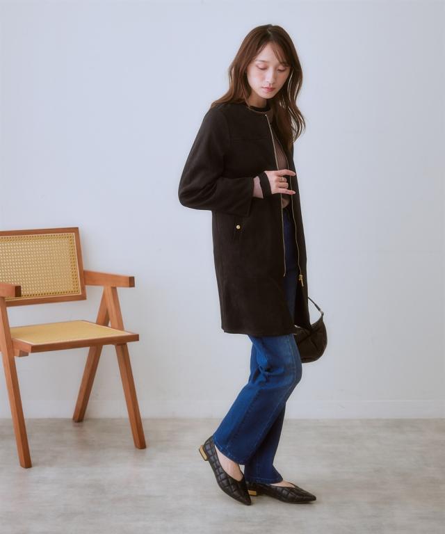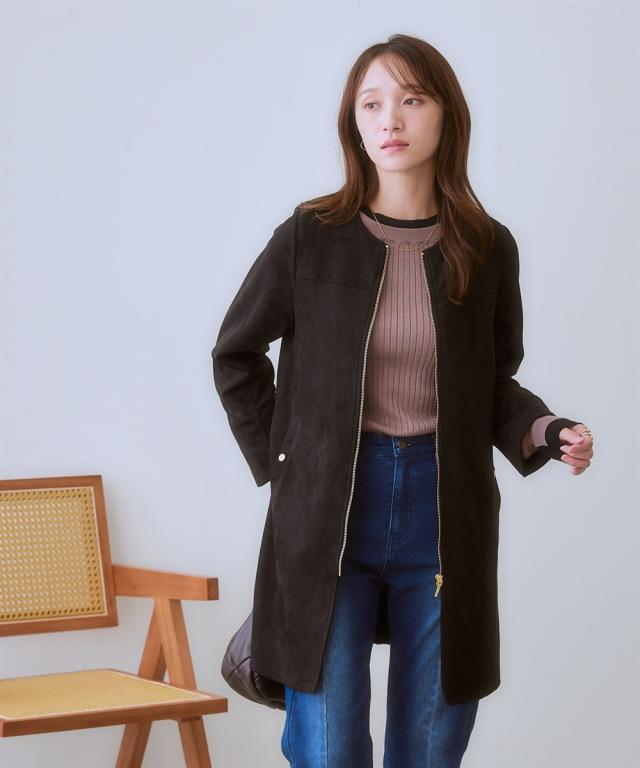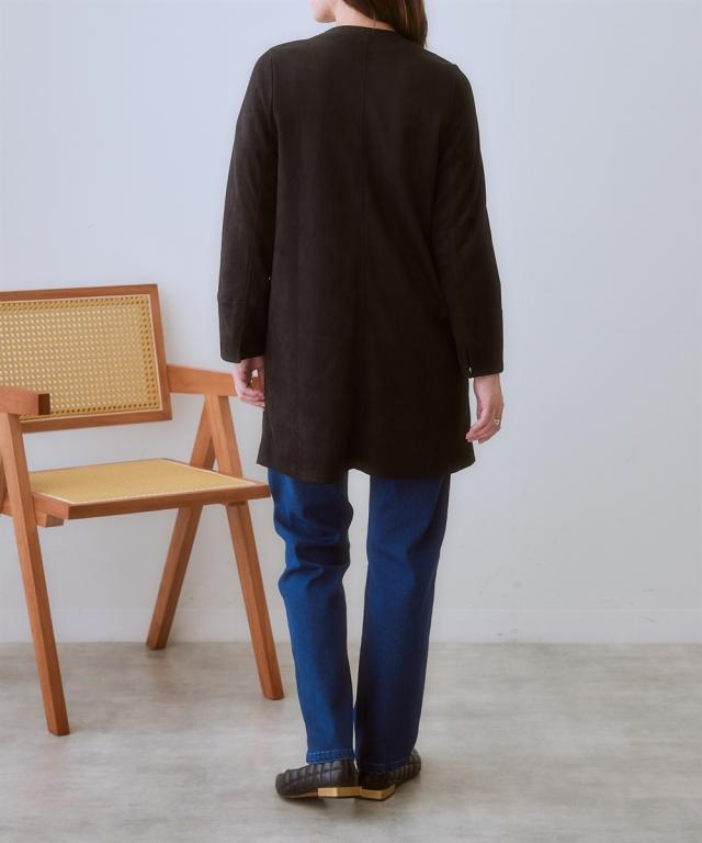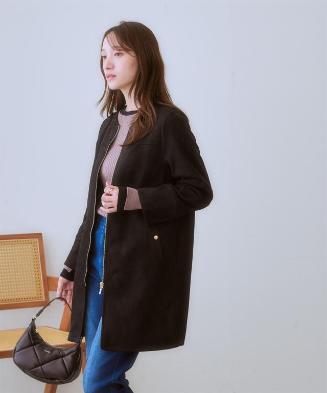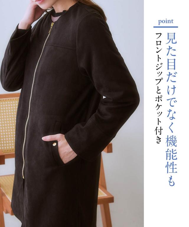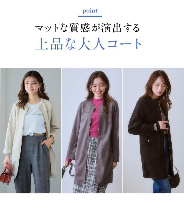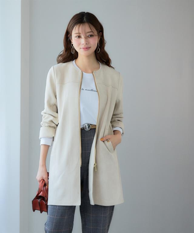 ロングセラーのフェイクスエード生地を使用した、上品なノーカラーデザインのフェイクスエードコート。 ■デザイン 縦のラインを強調するすっきりとしたシルエットは、気になる体型をさりげなくカバーしつつ、スタイリッシュな着こなしを叶えます。 フロントのジップアップデザインは着脱しやすく、ゴールドカラーがカジュアルすぎず上品に格上げしてくれます。 どんなインナーにも合わせやすい丈感で、オフィスからデイリーまで幅広いシーンで活躍。 袖口はスリットデザインになっており、折り返しての着用も可能です。 季節の変わり目にサラッと羽織りたいロングシーズンお使いいただけるアイテムです。 ■素材 本物のスエードのようなしっとり滑らかな肌触りと上品な光沢が魅力です。 ソフトなフェイクスエードの生地なので女性らしい優しい印象です。 柔らかいスエード調生地は、ストレッチ性もあり、いろんな動きについてきてくれるので、ノンストレスな着心地です。 軽量でありながらも適度なハリがあり、美しいシルエットをキープします。 シワになりにくく、お手入れが簡単なのも嬉しいポイント。 ■おすすめのスタイリング インナーにシンプルなTシャツとワイドパンツを合わせれば、こなれ