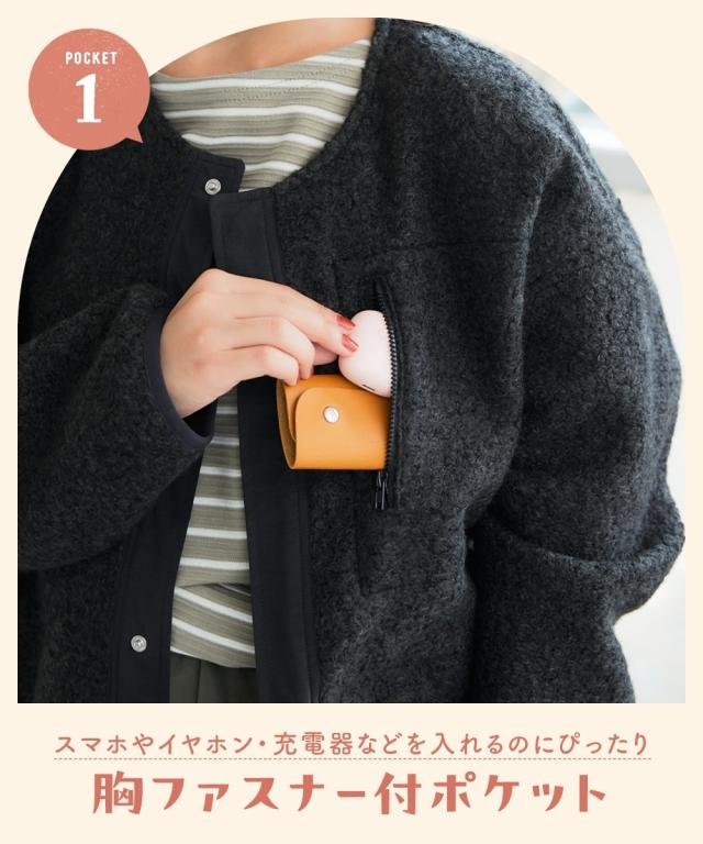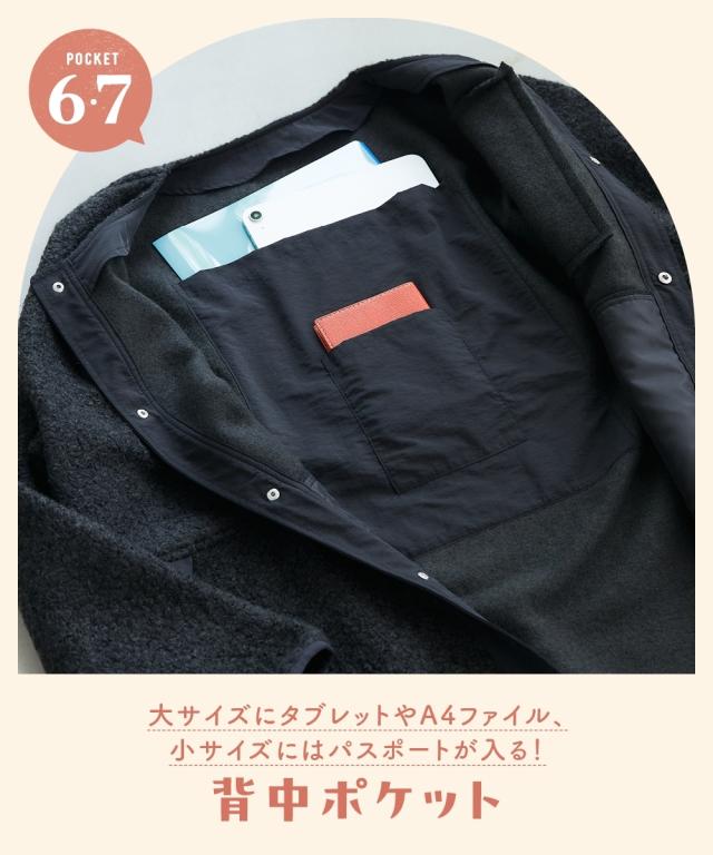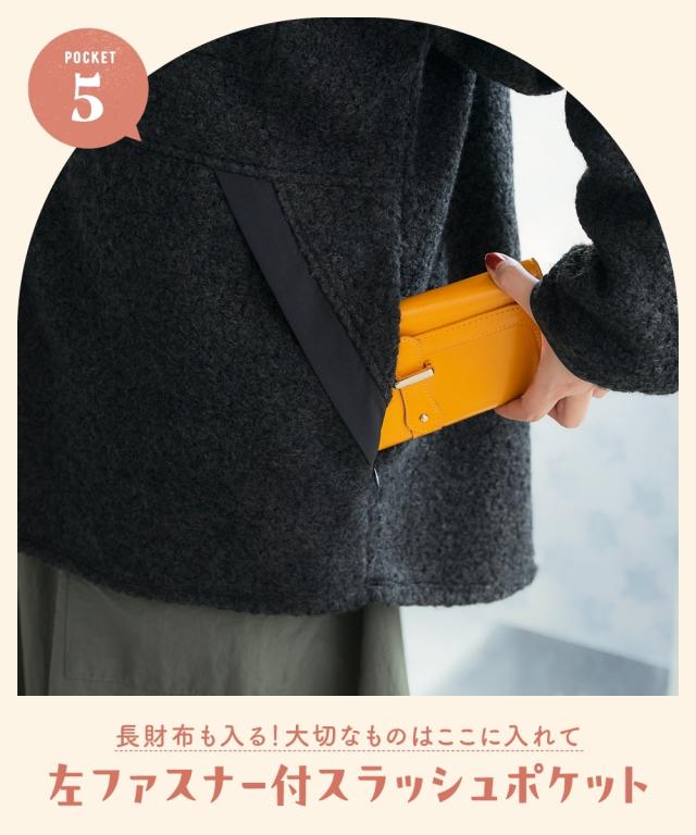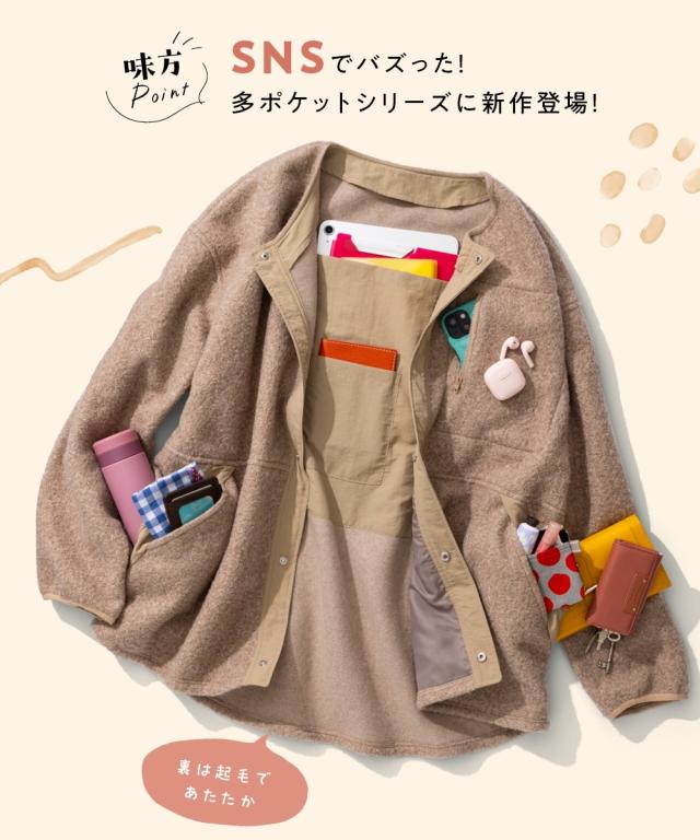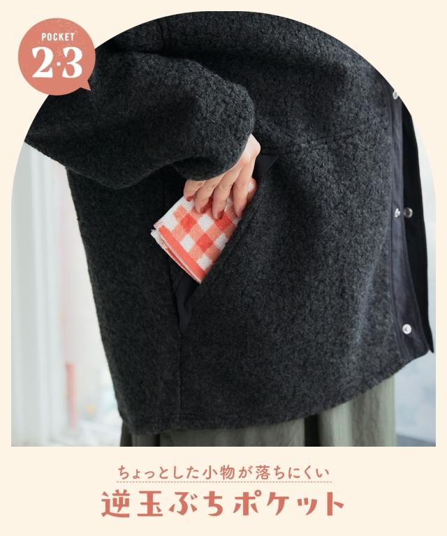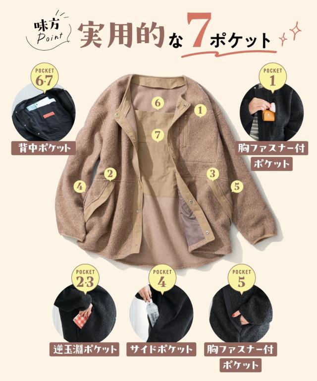 暮らしに寄り添うデイリーウェア【私の味方服】毎日の着やすさをトコトン追及なにげない毎日をさりげなく幸せにしてくれる!そんな「頼れる味方」になってくれる【私の味方服】多ポケットシリーズ人気の多ポケットコートシリーズに新商品が登場 ・7ポケットで手ぶら感覚バッグ要らずで、A4サイズ・スマホ・財布・エコバッグ・ペットボトルなどをしっかり収納出来る軽量ボアジャケットコート・コート本体はボア素材なのに驚くほど軽量な設計。ポケットに物を入れても軽く着て頂けます!・まるで「着るバッグ」のように、これ1枚で手ぶらお出かけが叶います・裏起毛をふんわり起毛させているから、冬の始めから寒い季節まで快適ちょっとしたお買い物やお散歩はもちろん、旅行やアウトドアでも大活躍!毎日の暮らしをぐっと便利にしてくれます ■デザイン オーバーシルエットだから体型を気にせず着られるジャケットコート少し前後差のある着丈が、こなれ感を演出!部分的に布帛の別布を使いアクセントに!女性らしくカジュアルデイリーに活躍!7ポケットで手ぶら感覚のアウターです。 1.左胸ファスナーポケット(ポケット口約10cmタテ20cmヨコ14cm程度)・・・モバイルバッテリーやイヤホン・カードケ