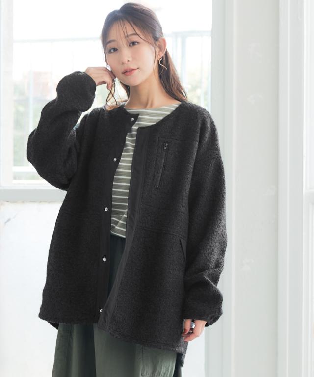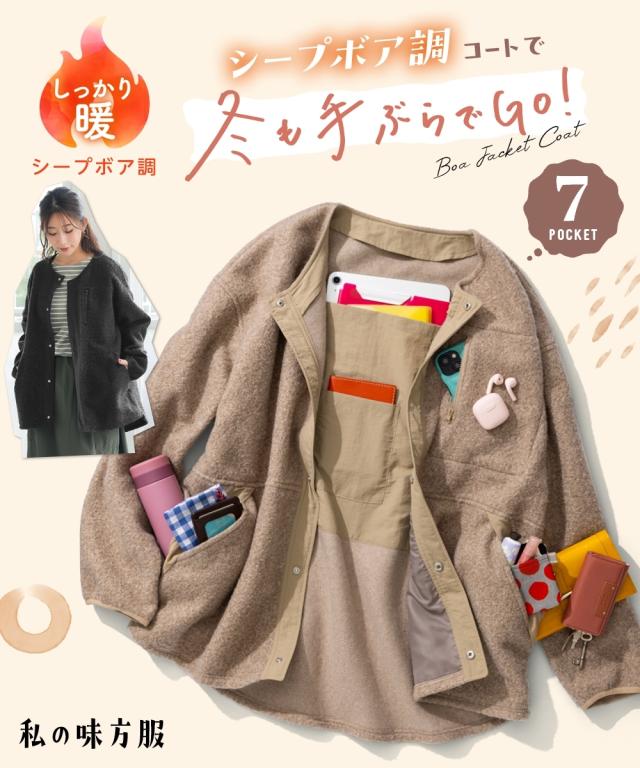 暮らしに寄り添うデイリーウェア【私の味方服】毎日の着やすさをトコトン追及なにげない毎日をさりげなく幸せにしてくれる!そんな「頼れる味方」になってくれる【私の味方服】多ポケットシリーズ人気の多ポケットコートシリーズに新商品が登場 ・7ポケットで手ぶら感覚バッグ要らずで、A4サイズ・スマホ・財布・エコバッグ・ペットボトルなどをしっかり収納出来る軽量ボアジャケットコート・コート本体はボア素材なのに驚くほど軽量な設計。ポケットに物を入れても軽く着て頂けます!・まるで「着るバッグ」のように、これ1枚で手ぶらお出かけが叶います・裏起毛をふんわり起毛させているから、冬の始めから寒い季節まで快適ちょっとしたお買い物やお散歩はもちろん、旅行やアウトドアでも大活躍!毎日の暮らしをぐっと便利にしてくれます ■デザイン オーバーシルエットだから体型を気にせず着られるジャケットコート少し前後差のある着丈が、こなれ感を演出!部分的に布帛の別布を使いアクセントに!女性らしくカジュアルデイリーに活躍!7ポケットで手ぶら感覚のアウターです。 1.左胸ファスナーポケット(ポケット口約10cmタテ20cmヨコ14cm程度)・・・モバイルバッテリーやイヤホン・カードケ