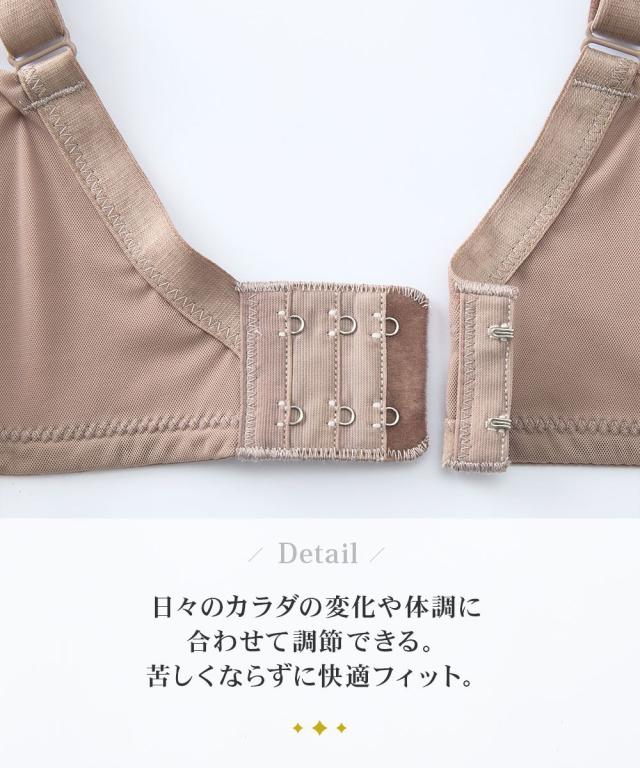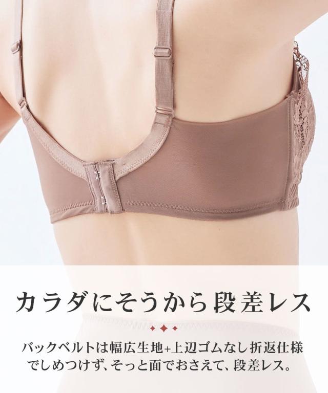 n,WIRELESS シリーズ バストを盛らず、自然なシルエットに整えるブラジャーです。 ・水着パッドのように薄い三角形のウレタンカップで、肌に馴染んでシルエットすっきり。 ・ノンワイヤーだけどカップサイズ展開なので、自分にぴったりのサイズが選べる。 ・バックベルトは脇高でパワーネット折り返し仕様。上辺はゴムがないのでカラダに食い込みにくく段差レス。 ・その日の体調や体の変化に合わせて着用できる、バックホック付き。 コーディネートできるショーツもご用意しております。