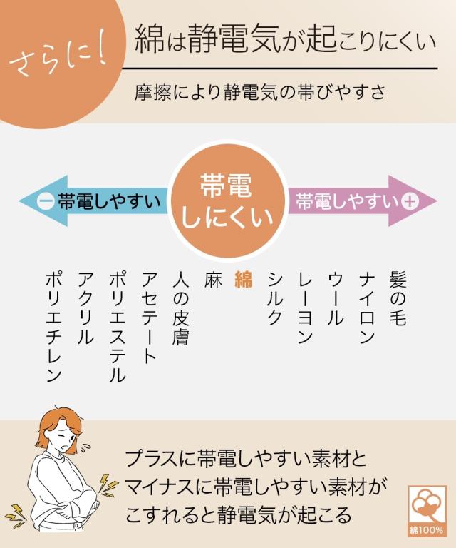 コットンは帯電しにくい素材のため、静電気が起こりにくい。
