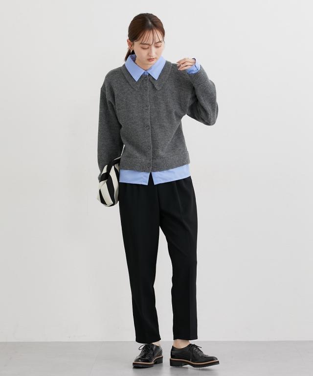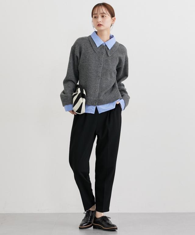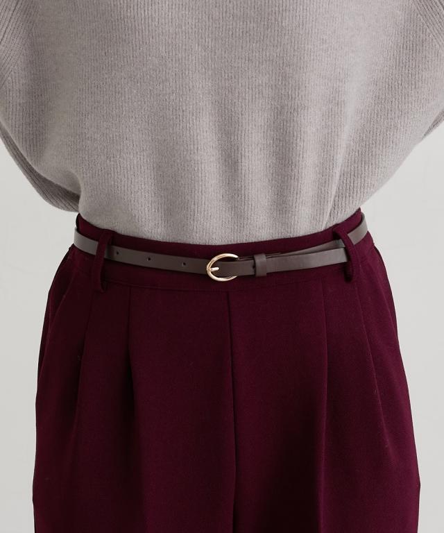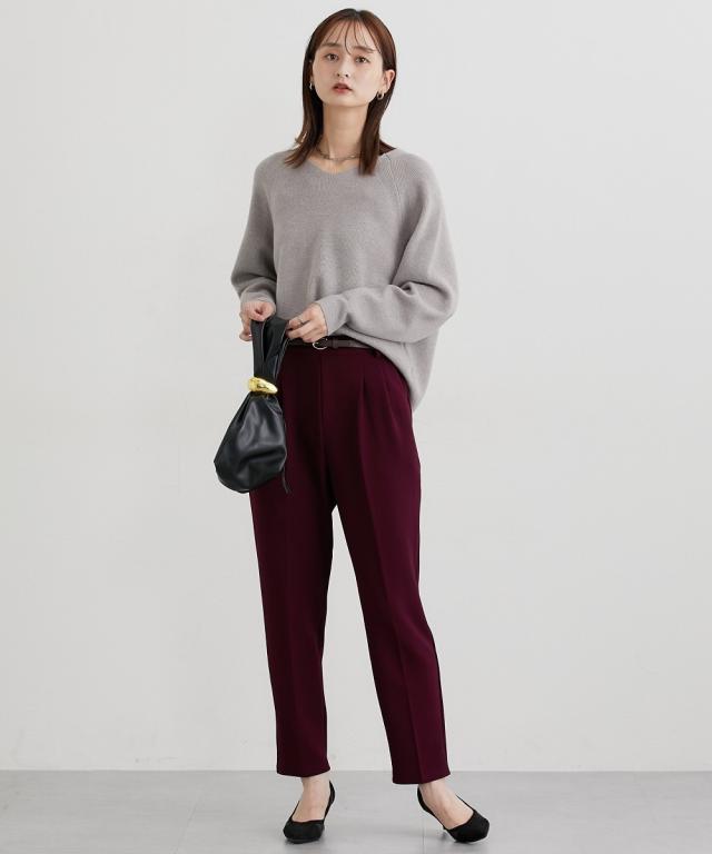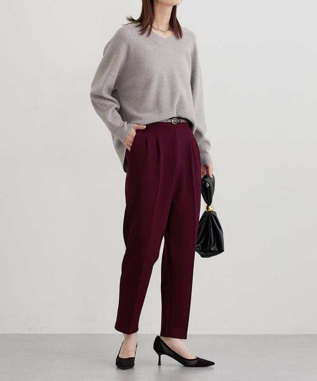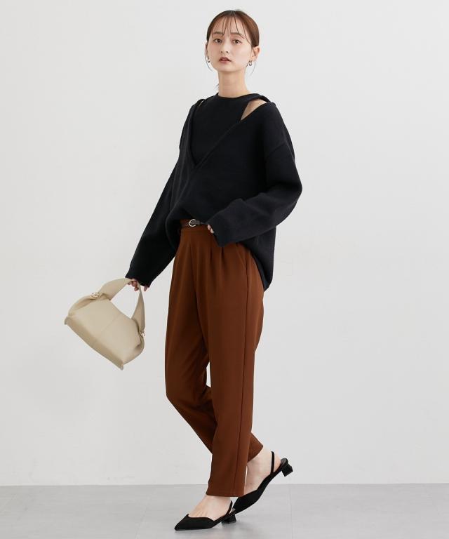 ■デザイン オンからオフまで着まわせるツータック仕様のテーパードパンツ。落ち着いたブラウンカラー×ゴールドバックルがかわいい細めのベルト付きできれいめコーデにぴったりのアイテムです。 ■素材 表面感のきれいなカットツイル素材を使用。細めの畝のある素材で通勤にも使えるカジュアルすぎない素材です。カットソーなのでストレッチ感があり着心地も快適。ネットに入れて洗濯機洗いOKなのでお手入れも簡単! ■おすすめのスタイリング とろけるチョコレートをイメージした秋冬にぴったりのカラー展開が特徴のアイテム。ゆるっとトップスのときは少しフロントインにしてベルトを見せるとバランスよく着こなせておすすめです!