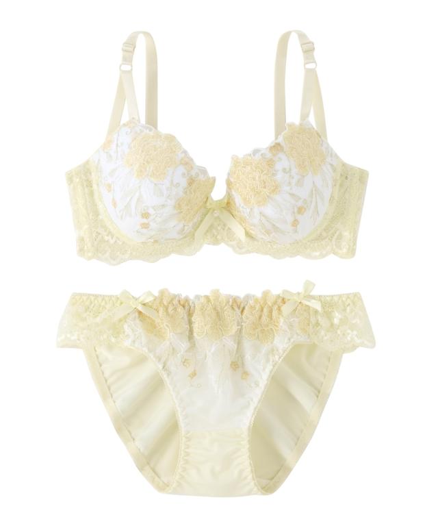キュートなブラ&ショーツが登場! 大きなフラワー刺繍が目立つデザイン! 胸元のリボンとパールで上品さアップ! 脇高設計で背中からしっかり寄せこみ、美谷間&美シルエット! パープル・イエローの2色展開です!
