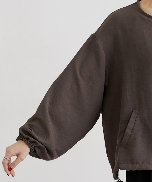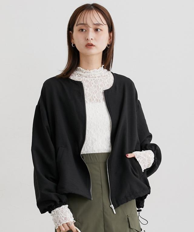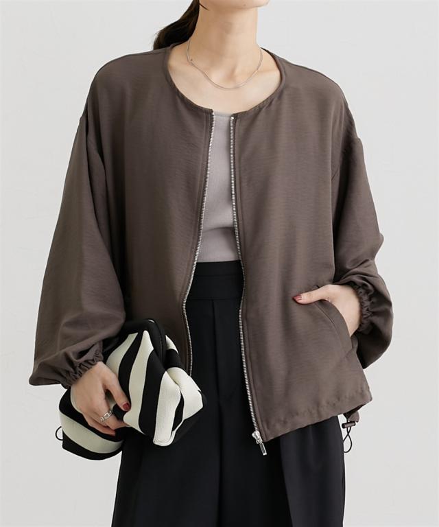 ■デザイン すっきり着丈で使いやすいノーカラーブルゾン。裾にはドロストコード入りでぎゅっと絞ったり、着丈の微調整もできる便利なトレンドアイテム。袖口にもゴム入りでプッシュアップして表情を変えられます。 ■素材 季節の変わり目に使いやすいしっかりめのデシン生地を使用。控えめな光沢感とろみ感がありデイリーからお出かけまで使えるアイテムです。ほんのりしぼ感があるのでしわも目立ちにくく、お家で手洗いも可能なのでお手入れも安心です。 ■おすすめのスタイリング シンプルなのでお手持ちのお洋服にはおりやすいデザイン。朝晩の気温差があるとき便利なアイテムです。カジュアル過ぎない素材なのでオンからオフまでたくさん着まわせます。