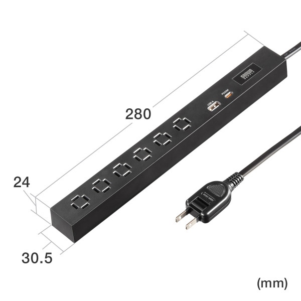 ■定格容量:14A・125V合計1400Wまで ■PSE適合規格:あり ■定格出力:DC5V・3A【Type-C】DC5V/3A、9V/3A、12V/2.75A、15V/2.2A、20V/1.65A(最大33W)【USB A】DC5V/3A、9V/2A、12V/1.5A(最大18W)【Type-C+USB A同時使用時】合計最大DC5V・3A(最大15W) ■差し込み口形状:2P ■USBポート定格入力:AC100V〜125V 50/60Hz ■プラグ形状:2P ■プラグ仕様:スイング式 ■絶縁キャップ:あり ■差込口タイプ:ノーマルタイプ ■差込口間隔:25.4mm ■差込口数:6個口 ■USBポート数:2ポートUSB-A×1ポートType-C×1ポート ■電源コード長:1.5m ■コード導体サイズ:1.8スケア(SQ)×2心、仕上がり外形寸法約4.2mm×7.6mm ■二重構造:あり ■コード色:ブラック ■主な対応国:日本 ■保護機能:過電流保護機能あり自動識別IC機能あり ■コードの種類:二重被ふくコード ■USB PD(USB Power Delivery)対応:○ ■製品サイズ:W30.5×D24×H280mm ■重量:約303g ※記載は商品仕様の一部です。仕様説明不足等の理由での返品はできません。特に適合等は必ずご確認ください。