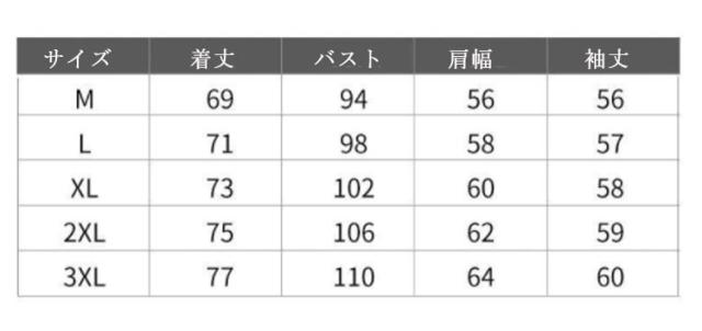 | サイズについての説明 | サイズ: 【M】お勧め身長160-165cm、お勧め体重55-57.5kg。 【L】お勧め身長165-170cm、お勧め体重57.5-65kg。 【XL】お勧め身長170-175cm、お勧め体重65-75kg。 【2XL】お勧め身長175-180cm、お勧め体重75-85kg。 【3XL】お勧め身長180-185cm、お勧め体重85-95kg。 ※サイズ表の実寸法は商品によって1-3cm程度の誤差がある場合がございます。 |