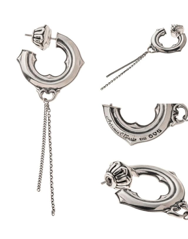 | 仕様 | シンプルなフープに2種類のチェーン、花モチーフのキャッチを組み合わせたピアス。アルテミスクラシックらしいトレサリーでレイヤード感のあるデザイン。細い喜平チェーンとアズキチェーンが連なり、耳元でゆらゆらと艶やかに揺れる姿が魅力です。フープ部分にはブランドロゴ、ホールマーク、「925」の刻印入り。銀の艶と輝きが美しいデザイン。程よいボリュームで着け心地も快適です。日常のコーディネートにアクセントを加える万能な一品です。 *1個単位(片耳分)での販売となります。 |