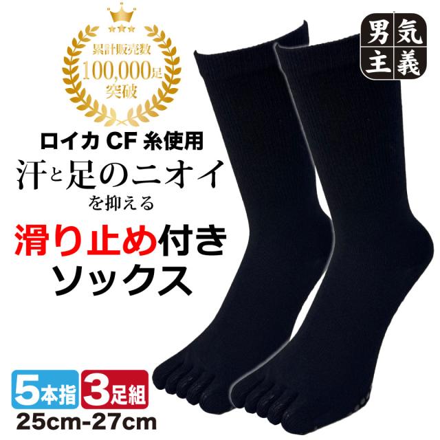 五本指靴下 メンズ すべり止め 消臭 旭化成ロイカCF 5本指 シリコングリップ ソックス 3足セット クルー丈 25cm-27cm 黒 スポーツ ワーク