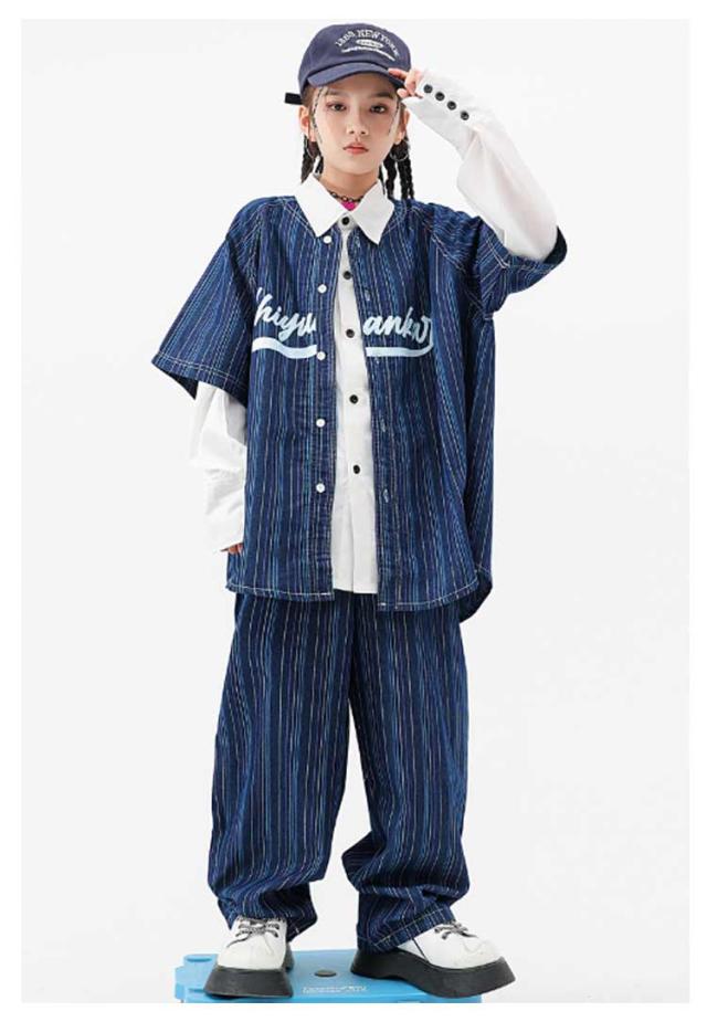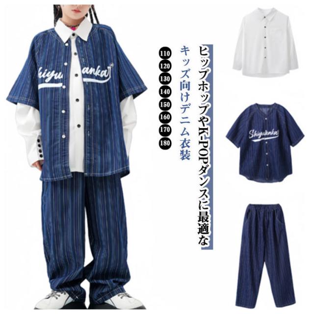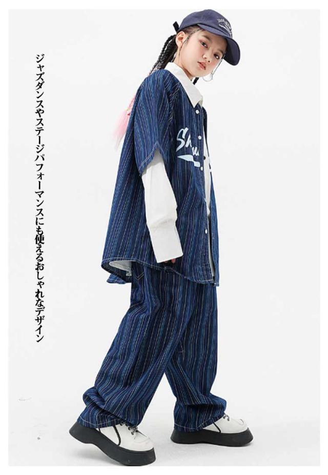 ヒップホップ キッズ ダンス衣装 ヒップホップ 半袖 ストライプ 目立つ デニム パンツ デニム hiphop ワイドパンツ シャツ ハーフトップ ダボパン k-pop 女の子 服 かっこいい 韓国 目立つ 演出服 練習着 発表会 普段着 原宿系