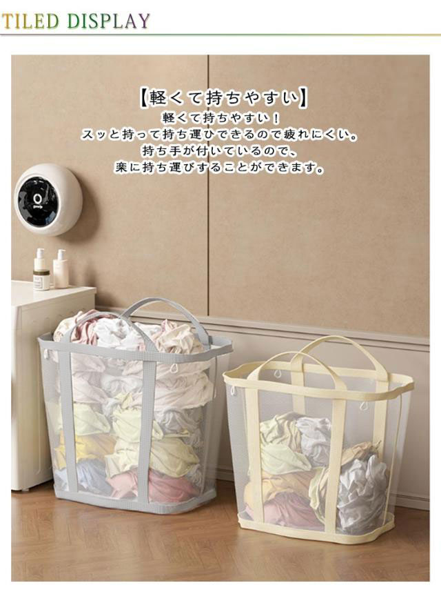 | 【軽くて持ちやすい】 軽くて持ちやすい!スッと持って持ち運ひできるので疲れにくい。持ち手が付いているので、楽に持ち運びすることができます。 【通気性抜群のメッシュ】 通気性抜群のメッシコ素材だから湿気のある衣類を入れても臭いがこもらない。 【折り畳み式で収納便利 】 使わない時は、折りたたんで、洗濯機横のすき間などに 省スペースで収納でき、邪魔になりません。 【壁掛けストラップ付き】 壁掛けフック付いて場所を取らずスッキリ収納、洗濯機横や璧に掛けが出来るので便利。 【 様々なシーンで大活躍】 収納バスケットとしても大活躍。リビングや寝室の散らかりがちな小物や、お子さまのおもちゃなどをひとまとめに収納できます。買い物カゴとしても使いやすい。 | |