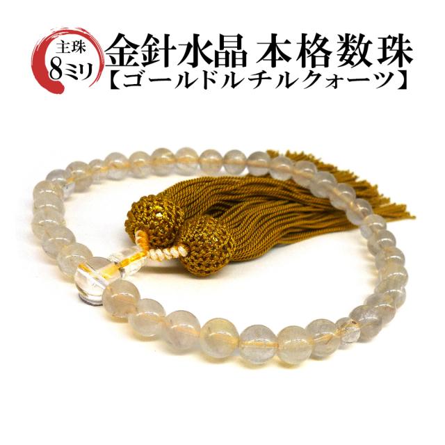 「職人仕立て」 男女兼用 数珠 8mm 金針水晶(ゴールドルチルクォーツ) 念珠 男性用 女性用 略式数珠 メンズ レディース 仏具 神具 天然石 パワーストーン ゴールドルチルクオーツ 人絹頭付房 葬式 葬儀 法事 イエロー 黄色