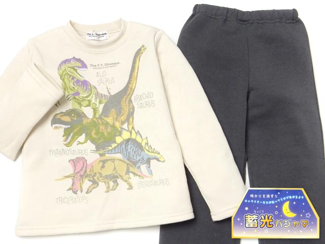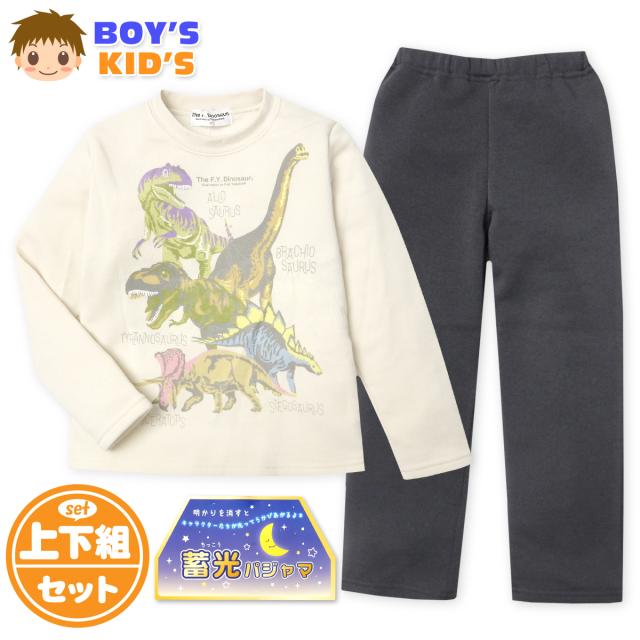 【送料無料】男児 キッズ 裏起毛 長袖 光るパジャマ 上下組 恐竜 ダイナソー あったか素材 保温性 蓄光プリント 子供服 男の子 100cm 110cm 120cm 130cm yg-3125【メール便対応】