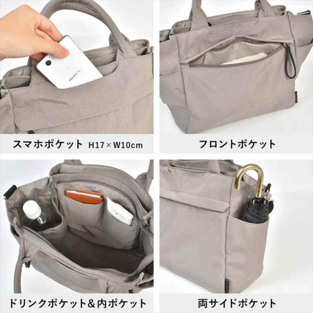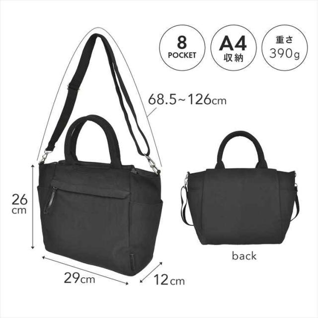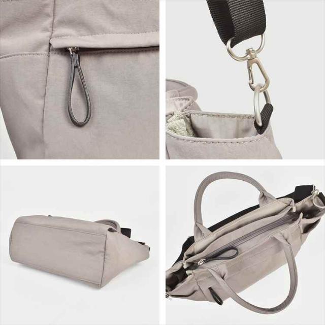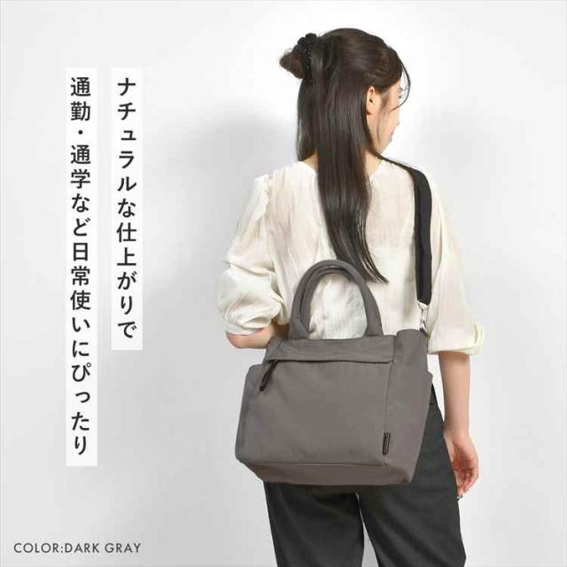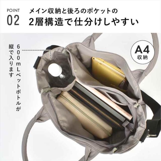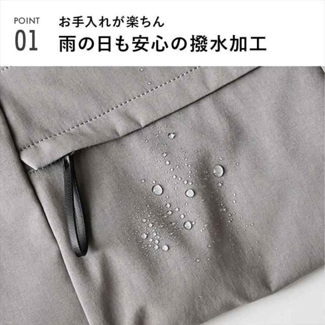 撥水生地の2wayショルダーバッグ。あえて金具感を極力なくしたナチュラルな仕上がりが特徴。どんな服装にも合いやすく、ラクを追求したバッグです。雨の日でもお手入れ楽ちんな撥水加工。A4サイズ対応で、毎日の通勤・通学にもおすすめです。メイン収納部分と後ろにポケットがある2層構造で整理整頓がしやすい◎スマホをしまうのに丁度いいポケット付き。600mLペットボトルが縦に入るドリンクポケットあり。