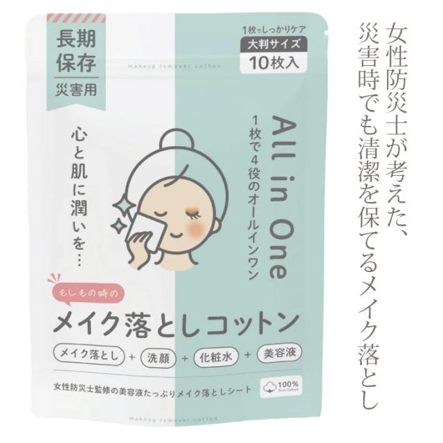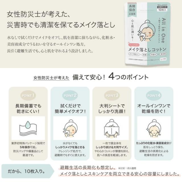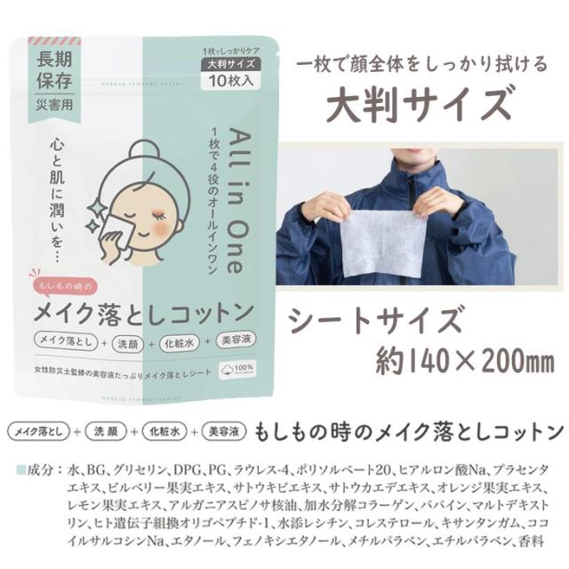 防災用メイク落としシート 5年保存 水なしで使える 大判サイズ 10枚入り チャック付 化粧落としコットン タオルシート 女性向け 災害時・断水時の衛生対策に最適 防災グッズ 備蓄用