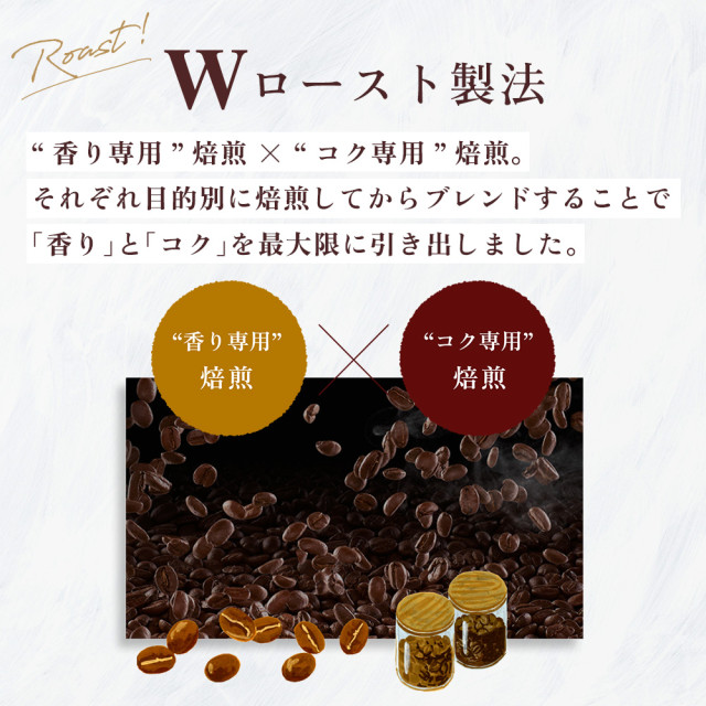 ●Wロースト製法:“コク専用”焙煎ד香り専用”焙煎。それぞれ目的別に焙煎してからブレンド。