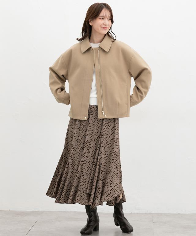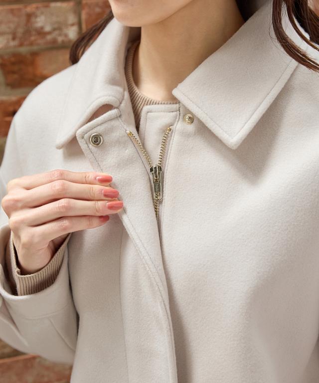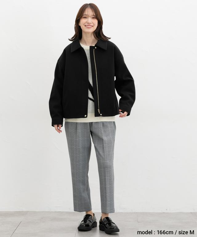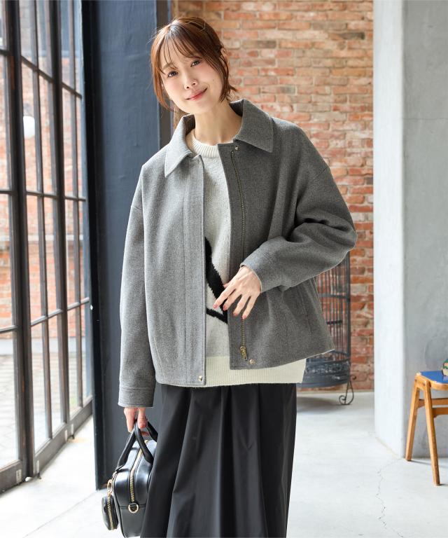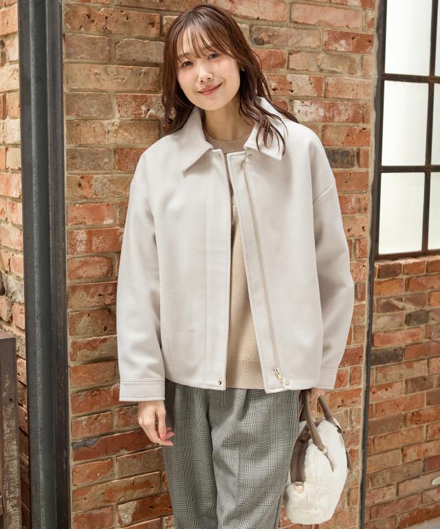 なめらかな素材感や比翼仕立て、ゴールドのファスナーやボタンで、メンズライクになりすぎず上品な印象に。