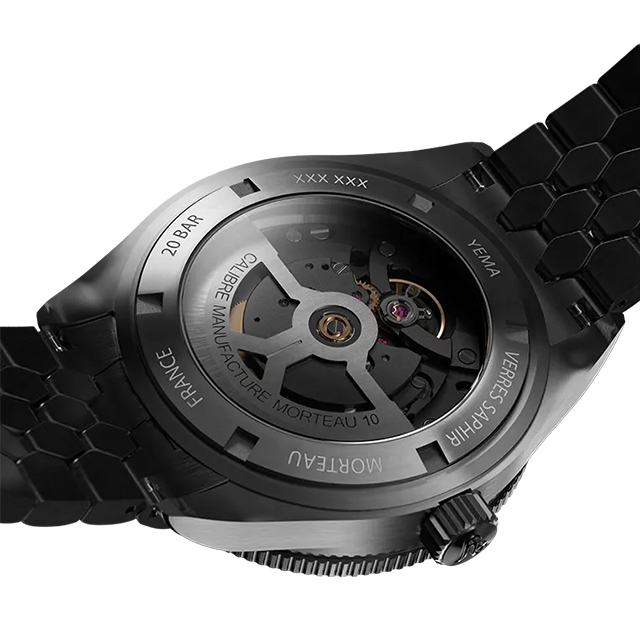| 仕様 | 20気圧防水 振動数28,800回/時間 クロノメトリック精度 パワーリザーブ:70時間 日付表示 "プッシュ・トゥ・アンロック"ベゼルロック機構 スーパールミノバ(針・インデックス) マイクロアジャストメント機構付き バックスケルトン ねじロック式りゅうず フランス製 |
