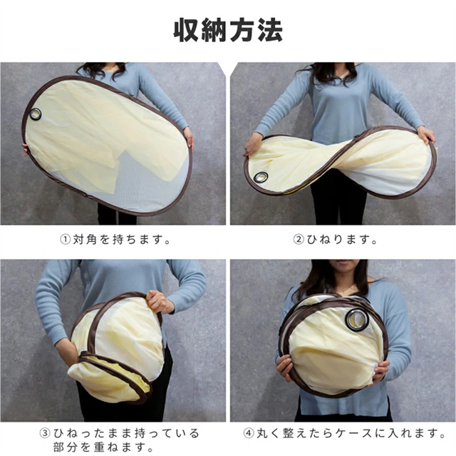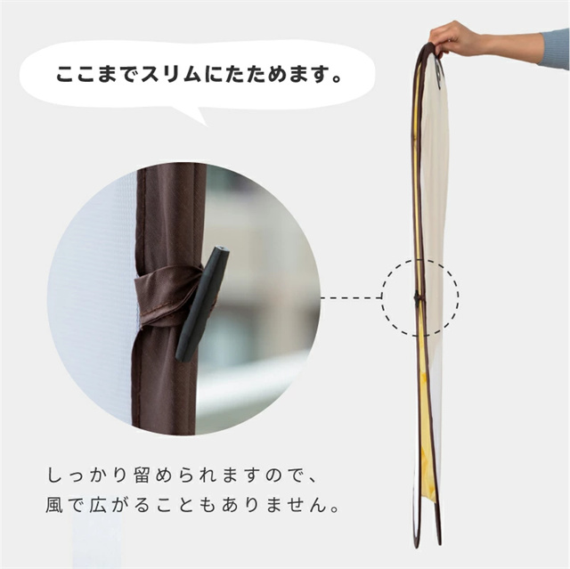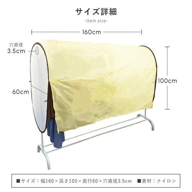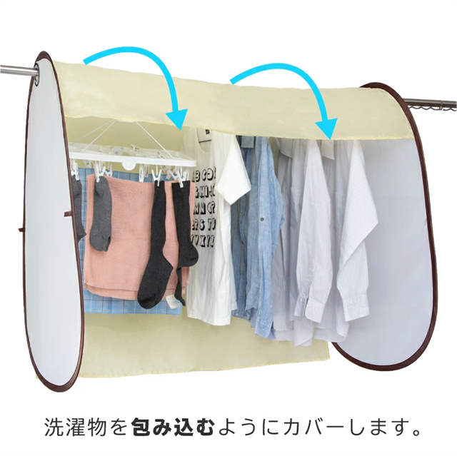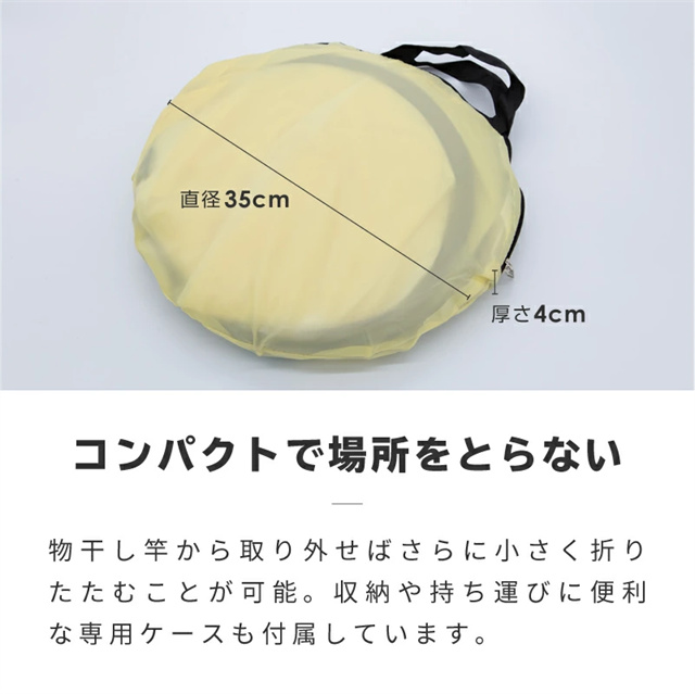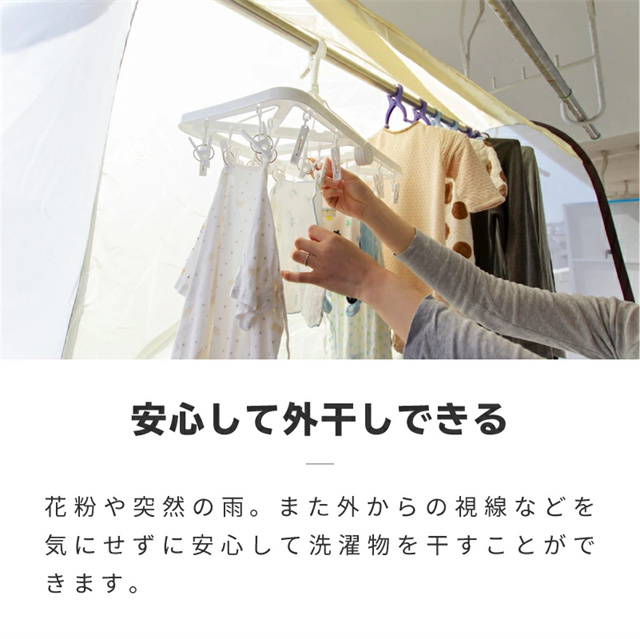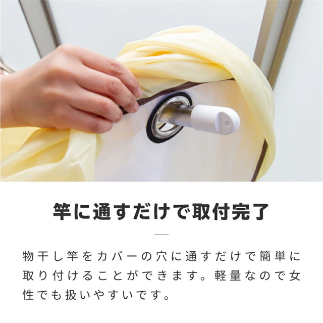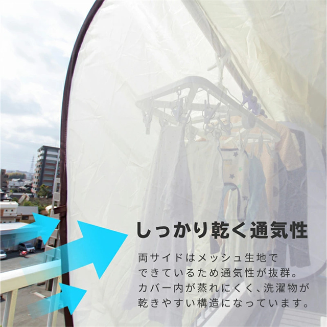 | ポイント | 外干しする時に起きる、雨や日差し、視線などの問題をカバーで解決。 気候や人目を気にせずに洗濯物を干すことができます。 突然雨が降り出すかもしれない微妙な天気の日でもカバーを使えば外干しOK。 鳥のフンからのガードにもピッタリです。 UVカット率98.8%の生地を採用して紫外線によるダメージを軽減。 花粉や黄砂、PM2.5などの汚染物質の付着も防ぎます。 両サイドはメッシュ生地でできているため通気性が抜群。 カバー内が蒸れにくく、洗濯物が乾きやすい構造になっています。 前面・背面は水を弾きやすいポリエステルとEVA樹脂製のカバーを使用。 耐候性・速乾性にも優れ、お手入れもしやすくなっています。 カバーは洗濯物の目隠しとしても活躍。 人目に触れてほしくない下着類なども外干しすることが可能です。 物干し竿に取り付けたまま折りたためるから、その都度着け外しする必要なし。 カバーを使用しない時も邪魔になりません。 物干し竿をカバーの穴に通すだけで簡単に取り付けることができます。 軽量なので女性でも扱いやすいです。 物干し竿から取り外せばさらに小さく折りたたむことが可能。 収納や持ち運びに便利な専用ケースも付属しています。 |