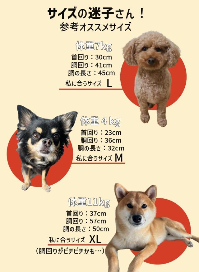 首の付根から尾の付根 胴回り 首回り XS 20 30 34 S 25 35 35.5 M 30 40 37 L 35 45 38 XL 40 50 39