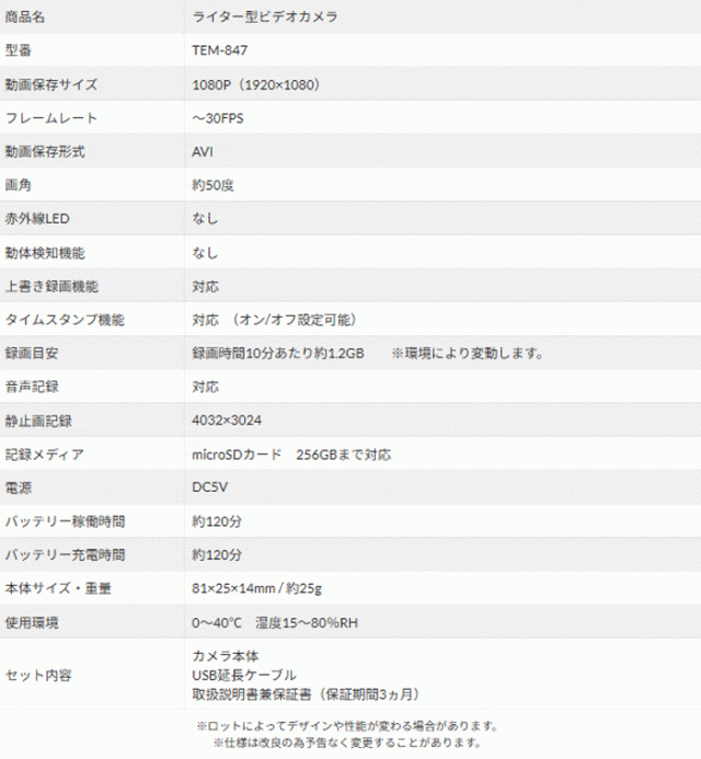 TEM-847は、フルHD(1920×1080)録画に対応ライター偽装(擬装)の小型カメラです。
