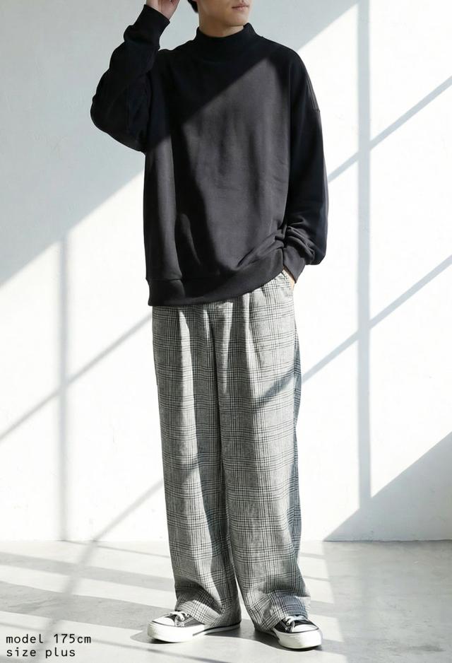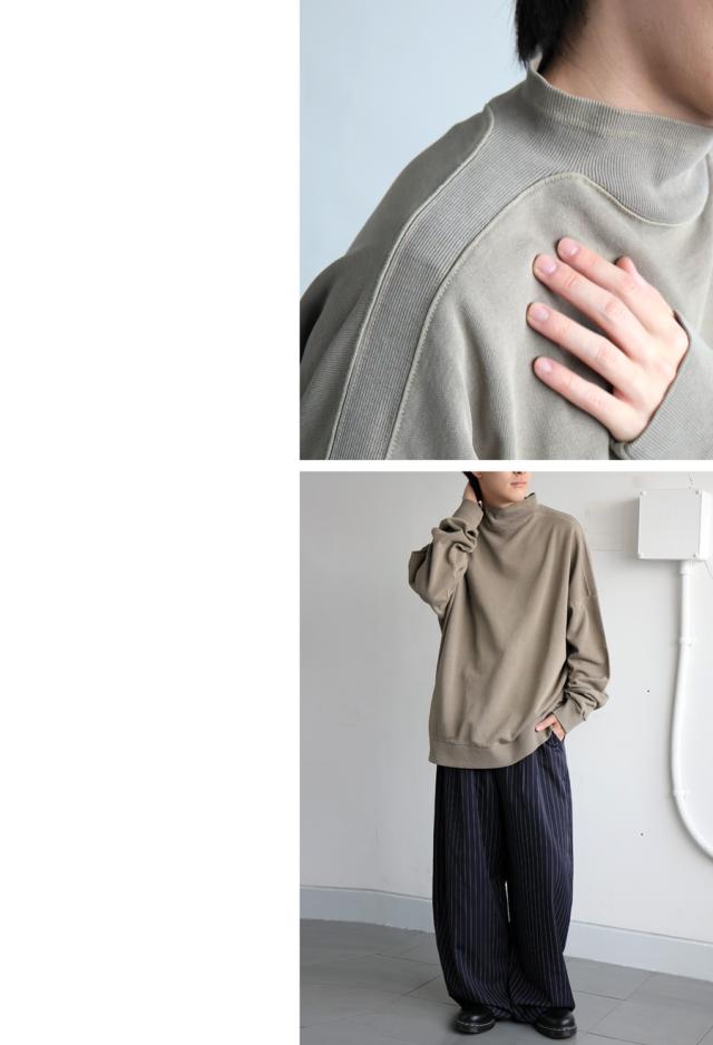 ネックラインは高めのハイネック(モックネック)仕様で、首元にさりげないアクセントを加えています。