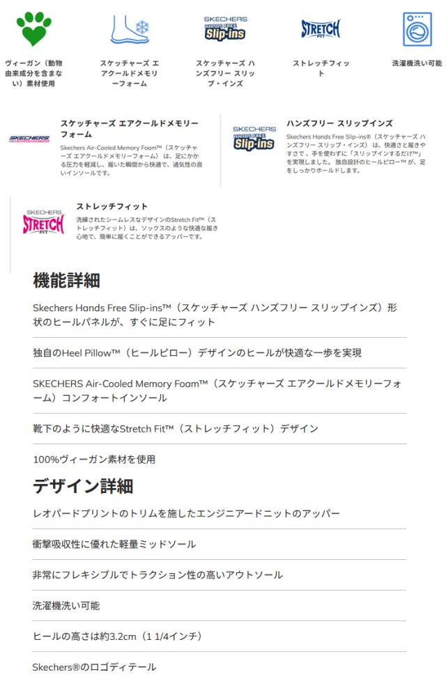Stretch Fit?(ストレッチフィット)エンジニアードニットを使用したアッパーに、レオパードプリントを施したSkechers Slip-ins(スケッチャーズ スリップインズ)モールド ヒールパネルを組み合わせたレースレスのスタイルです。