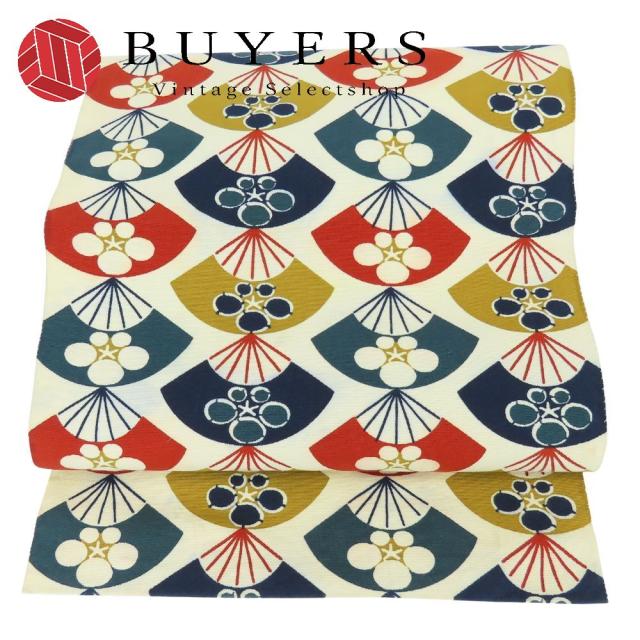 | 品名 | 中古 名古屋帯 八寸 ウール ホワイト マルチカラー 全通柄 扇子柄 レディース 女性 |